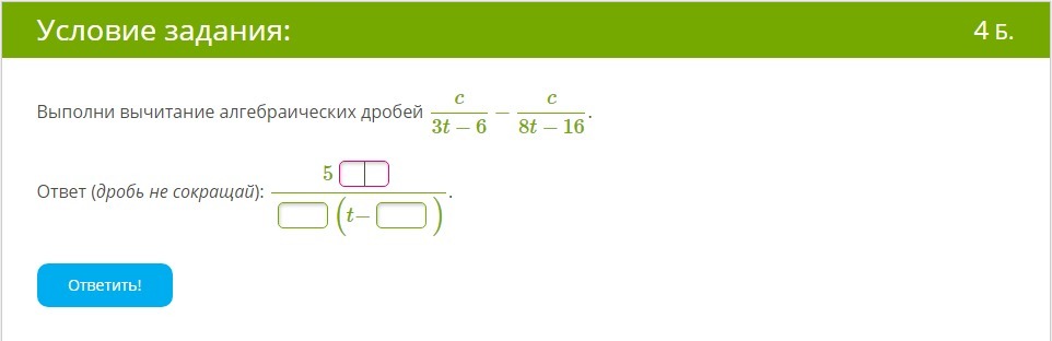 =  frac{c}{3(t - 2) }  -  frac{c}{8(t - 2)}  =  frac{8c - 3c}{3 times 8 times (t - 2)}  =  frac{5c}{24(t - 2)}