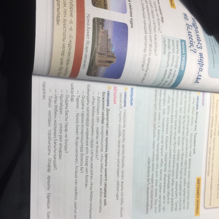 5-тапсырма. Диалогтегі көп нүктенің орнына қажетті сөздерді Қажетті сөздер: ескерткіштер, "Ұлы Жібек жолы», жібек матасы.