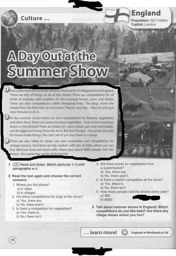 Есть много вещей, которые нужно сделать на выставках. Есть соревнования для видов животных, с трофеями для победителей, коров и овец. Есть также соревнования, называемые трисами овчарок. Собаки переносят овец из поля в причуду. Они очень крутые - у них есть только девять минут. На летних выставках есть много соревнований за цветы, овощи и другую еду. На изображении есть несколько овощей. Посмотрите на бобы эноэмо на картинке. Здесь есть приа для cakans, хлебного джема и мармелада, а также для яиц и меда из фейма. Но не забывайте, что призы могут быть сделаны только для домашних вещей. Выиграйте кошки, если купите их в магазине. 9 Существует множество раллийных автомобилей, спортивных состязаний и соревнований для старинных тракторов. Это большие рынки с множеством ссор, когда вы можете купить тодс и местные ремесла. Каждый год около 9200 человек посещают семинары. это отличная семья