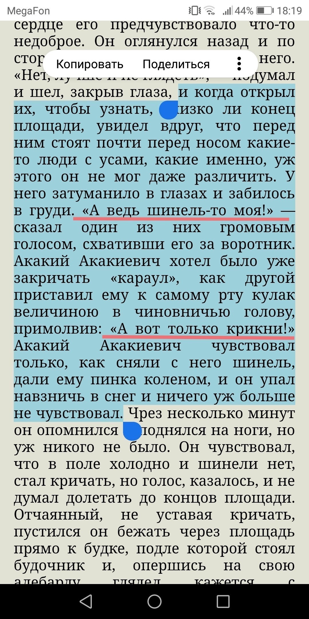 Если я не ошибась, то это слова призрака, который крадет шинель у значительного лица, а вопрос про ограбление Акакия Акакиевича....