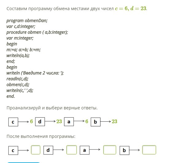 После выполнения программы должно быть так: c=2, d=23, a=23, b=2