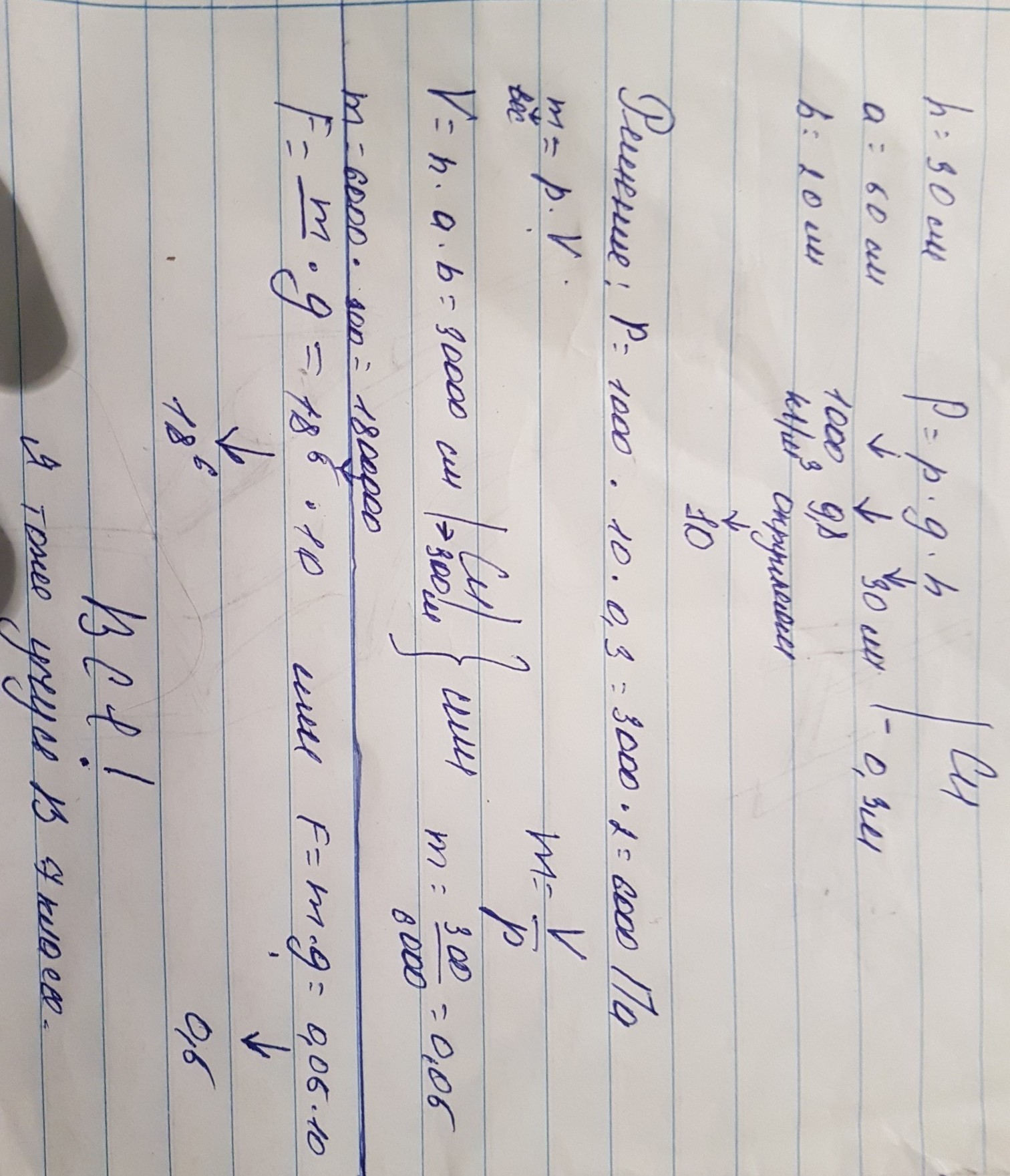 В аквариум высотой 30 см, длиной 50 см, шириной 20 см налита вода. Рассчитайте давление воды на дно, вес воды, силу, с которой вода действует на стенку шириной 20 см.
