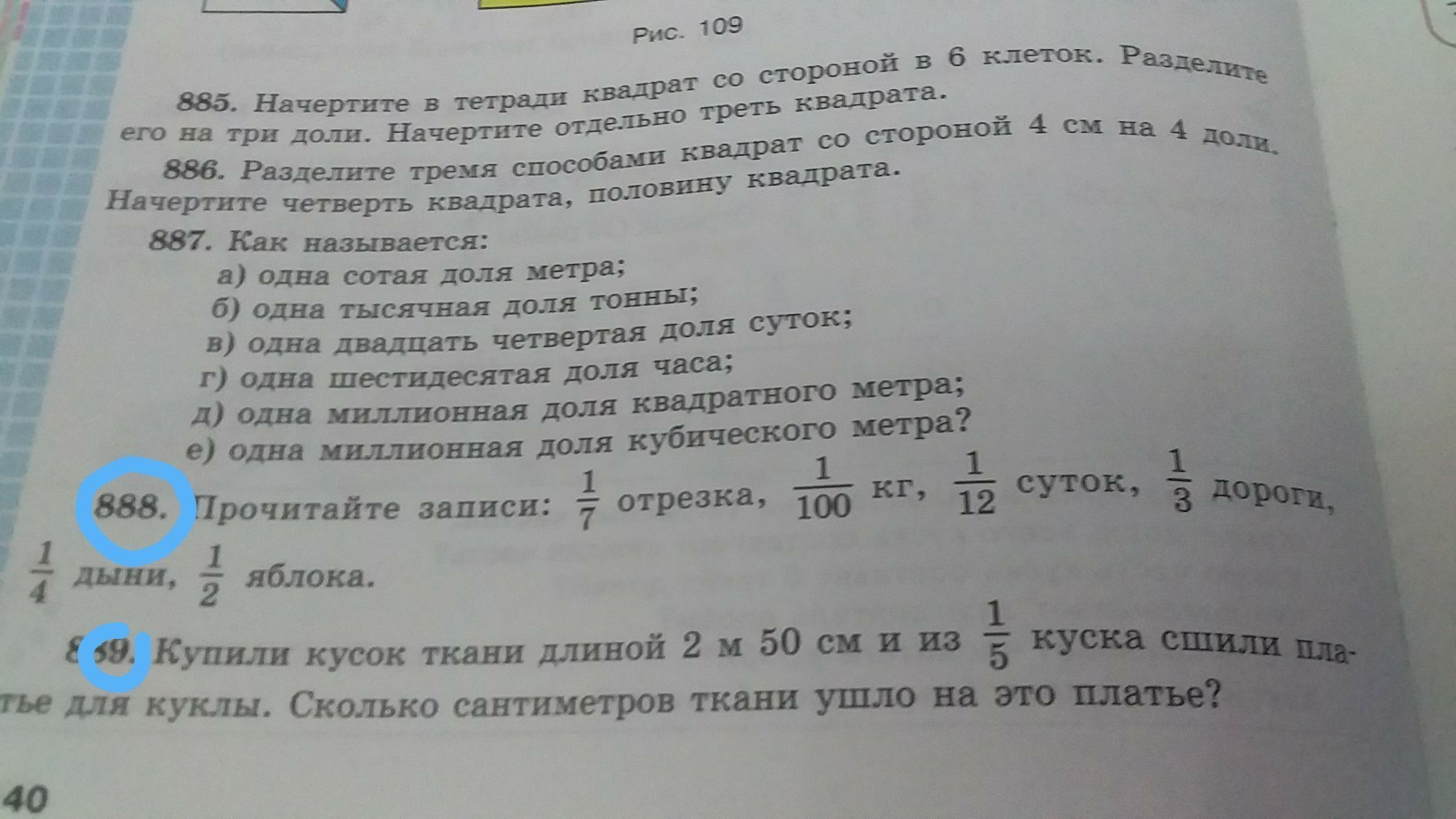 номер 888: одна седьмая отрезка, одна сотая килограмма, одна двенадцатая суток, треть дороги( одна третья дороги), четверть дыни(одна четвертая дыни), одна вторая яблока