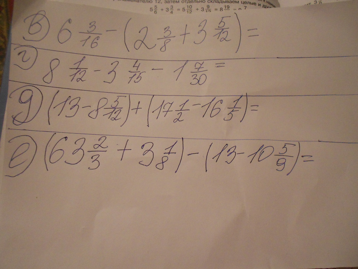 д) (13 - 8 5/12) + (17 1/2 - 16 1/5) = 4 7/12 + 1 3/10 = 5 + (35 + 18)/60 = 5 57/60