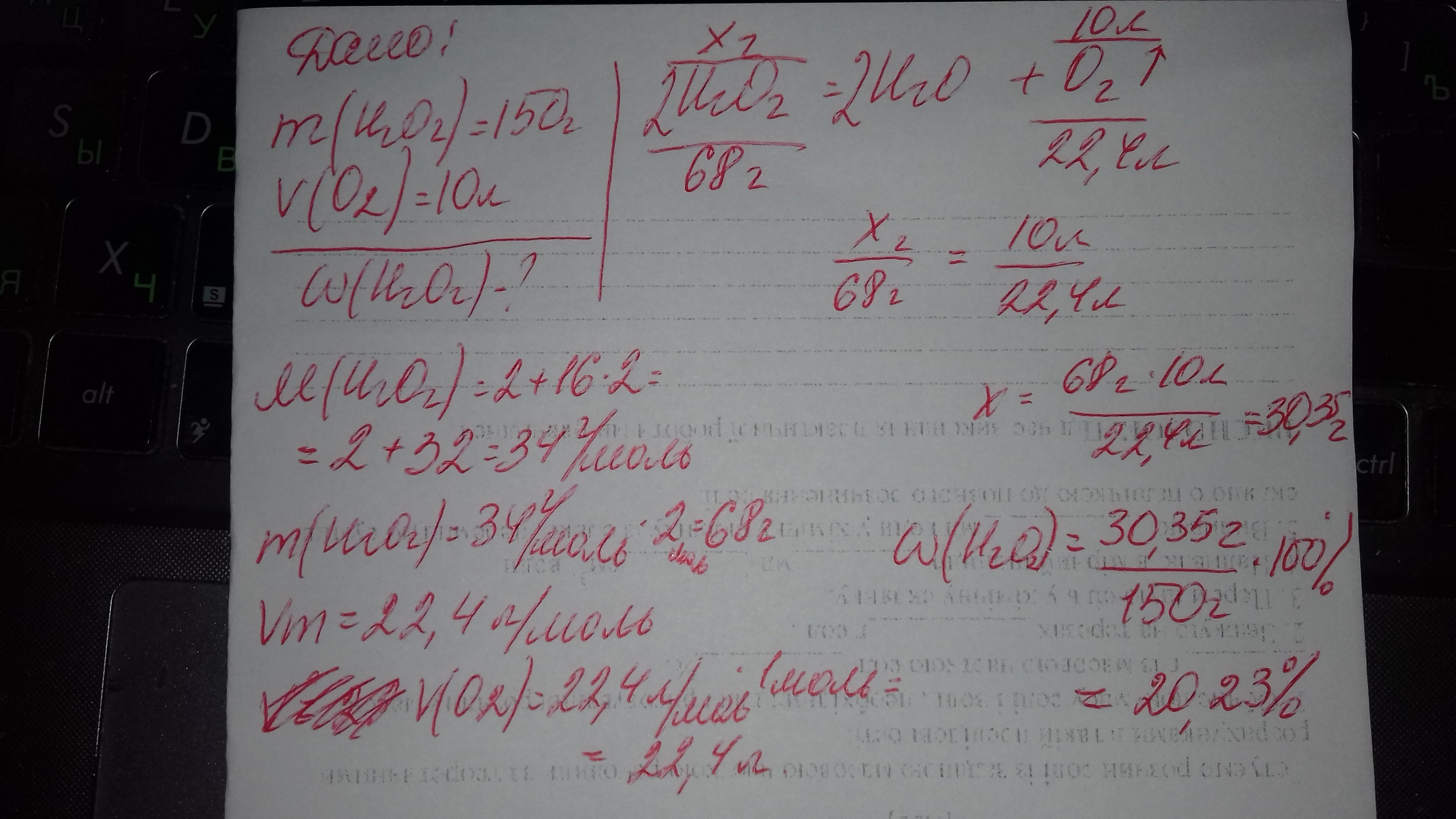 При разложении 150 г водорода выделилось 10 л кислорода. Найти массовую долю перекиси водорода в растворе.