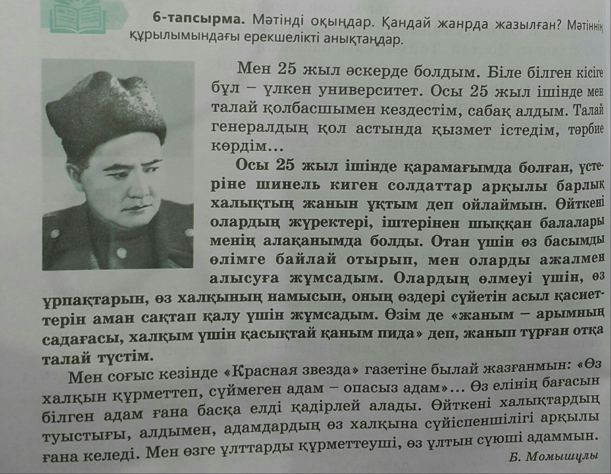 Лови ))).Я был в армии 25 лет. Это большой университет. За эти 25 лет я встречался со многими полководцами и получил урок. Я служил под руководством Талак генерала, видел воспитание. Я думаю, что за эти 25 лет, когда я не вижу, и через солдаты, которые носили шинель на" Усте", я не верю, что у меня есть все народы. Так как их сердца, дети из живота были в моих ладошях. За Родину, привязывая свою голову к смерти, я потратил их на выживание. Для того, чтобы они не умирали, я потратил на сохранение своих 3 - х поколений, чести своего народа, благородных качеств, которым они любят. И сам я не раз попала в горящий огонь, так как » душа моя - это беда, пида для народа". Я писал в газете «Красная звезда» во время войны: «человек, который не любит свой народ, - человек без измены»... Только тот, кто знал оценку своей страны, может почитать другую страну. Потому что родство народов, в первую очередь, происходит только через любовь людей к своему народу. Я человек, уважающий других национальностей, любящий свою национальность.