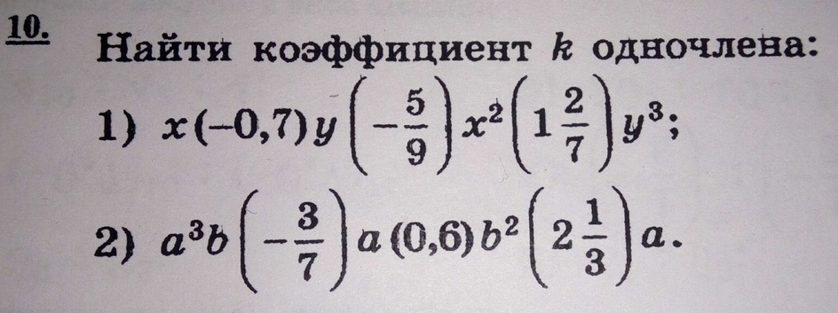x(-0,7), yBig (-frac{5}{9}Big ), x^2Big (1 frac{2}{7}Big ), y^3=frac{7}{10}cdot frac{5}{9}cdot frac{9}{7}cdot x^3, y^4=frac{1}{2}cdot x^3, y^4; ; ,; ; k=frac{1}{2}; ;\\\a^3, b, Big (-frac{3}{7}Big ), a, (0,6), b^2, Big (2frac{1}{3}Big ), a=-frac{3}{7}cdot frac{7}{3}cdot frac{6}{10}cdot a^5, b^3=-frac{3}{5}cdot a^5, b^3; ; ,; ; k=-frac{3}{5}