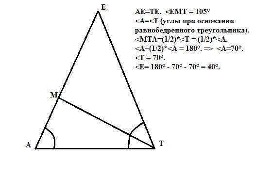 В равнобедренном треугольнике AET углы при основании равны, значит <A=<T. Угол АТМ = 0,5*(<T) , так как ТМ - биссектриса, значит в треугольнике АМТ