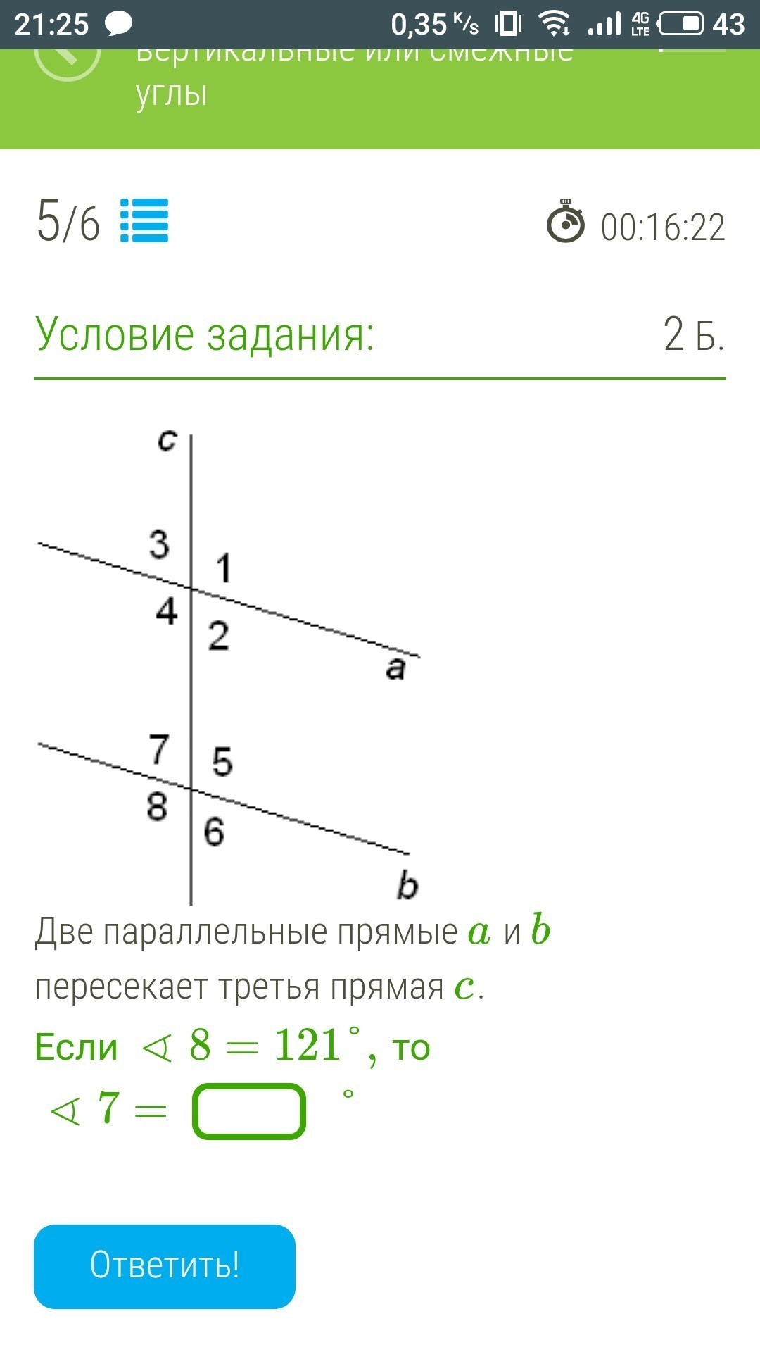 угол 7 равен 180 - угол 8 они смежные по одну сторону от прямой с