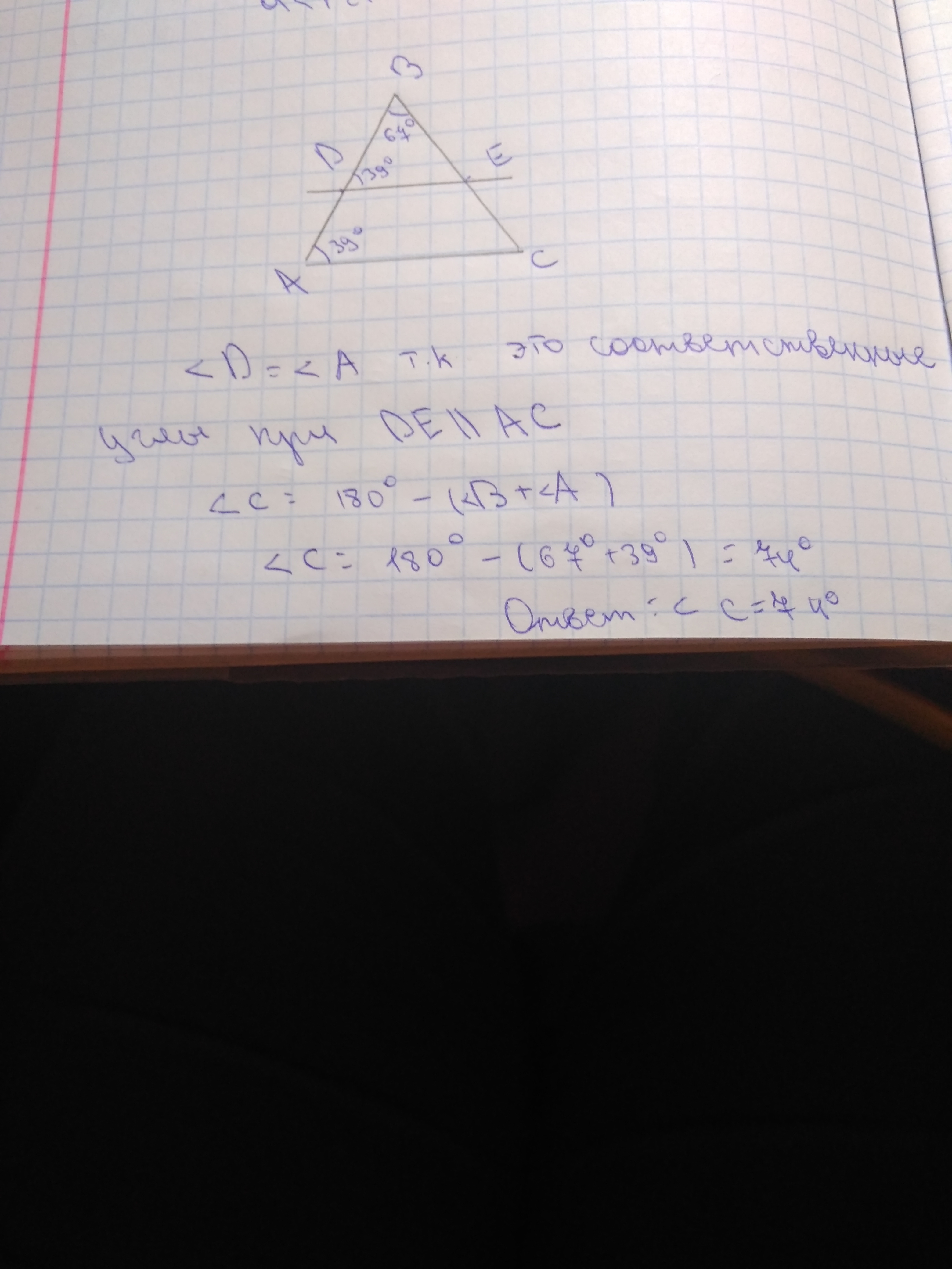 <D=<A т.к это соответственные углы при DE||AC.<C=180-(<A+<B) <C=180-(67+39)=74 градуса