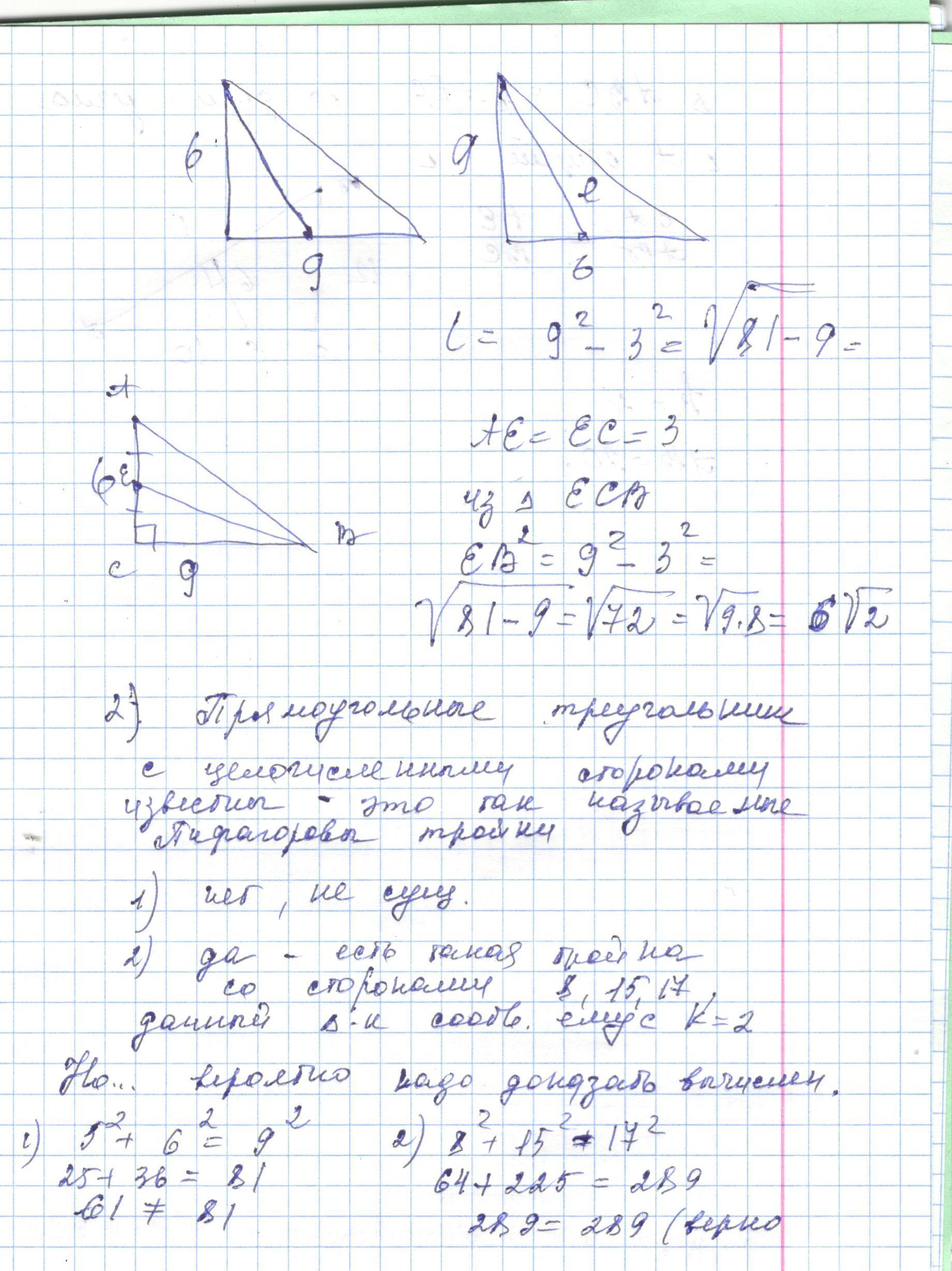 1. Катеты прямоугольного треугольника равны 6 см и 9 см. Найдите длину медианы, проведенной к меньшему катета.