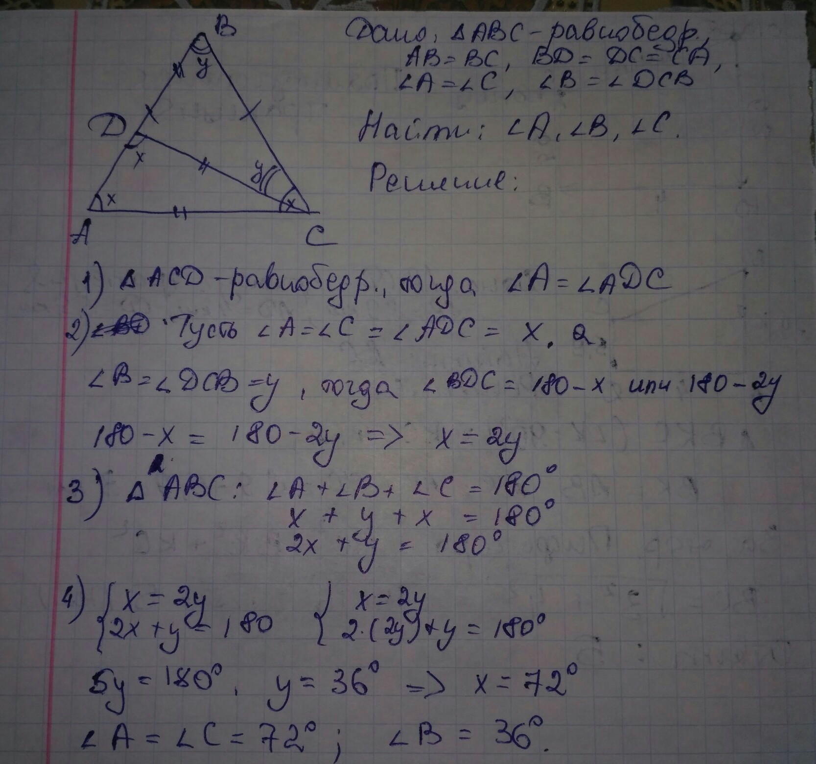 Дан равнобедренный триугольник АБС. Из угла С провели отрезок ДС. Найти угол А, Б,С, если АБ = БС, БД= ДС=СА. Угол А = углу С, а угол Б = углу ДСБ.