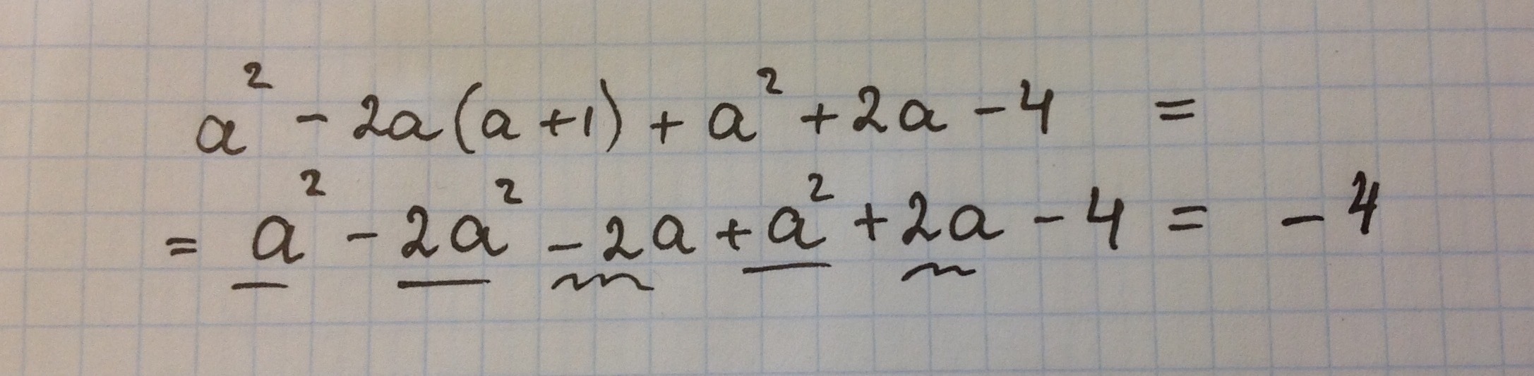 a² - 2a(a + 1) + a² + 2a - 4 = a² - 2a² - 2a + a² + 2a - 4 = - 4