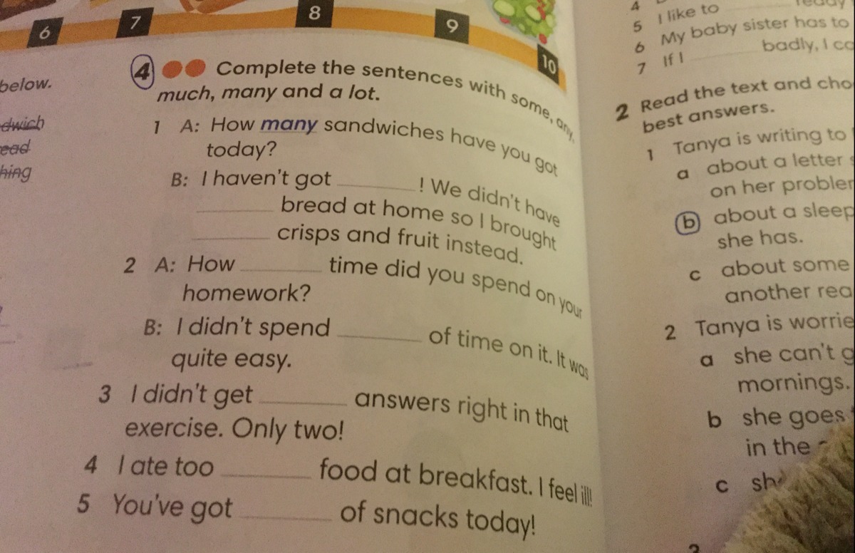 B: I haven't got any! We didn't have any bread at home so I brought some crisps and fruit instead.