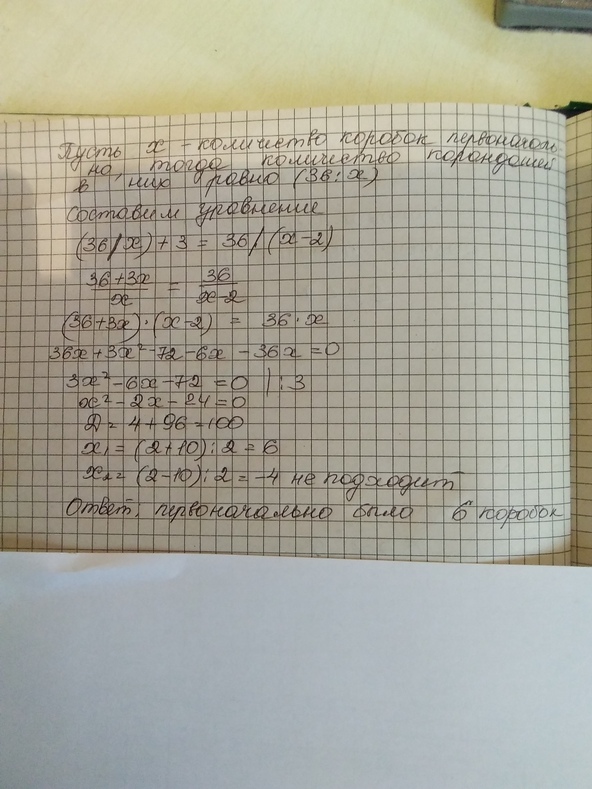 36 карандашей разложили поровну в несколько коробок если бы коробок было на 2 меньше то в каждую пришлось бы положить на 3 карандаша больше сколько было коробок? СРОЧНО ПОМОГИТЕ ПОЖАЛУЙСТА