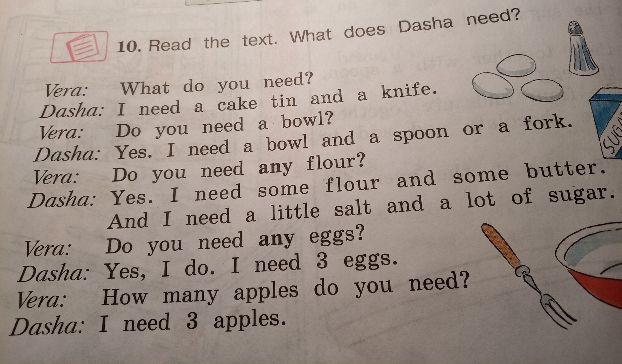 Are necessary to Dasha: the cake tin and a knife, a spoon or a fork,some sugar, bowl, a little salt, some flour and butter, three eggs, three apples