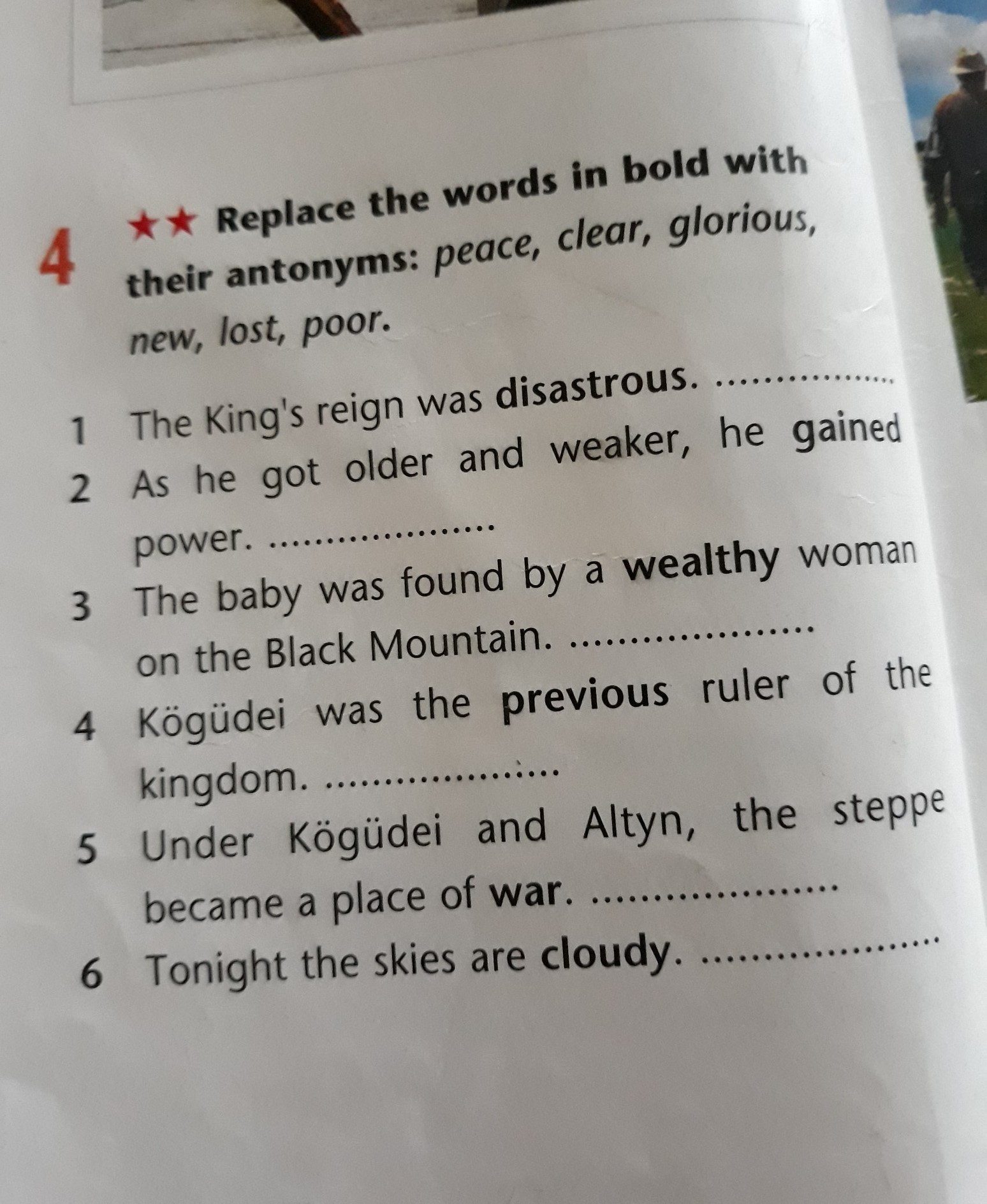4 Replace the words in bold with their antonyms: peace, clear, glorious,