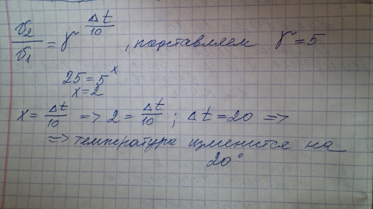 Скорость реакции уменьшилась в 25 раз. Как изменилась темпера- тура, если температурный коэффициент скорости реакции равен пяти?