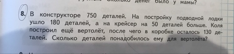 После вертолета, в коробке осталось 130 деталей. Значит на вертолет ушло 340 - 130 = 210 деталей.