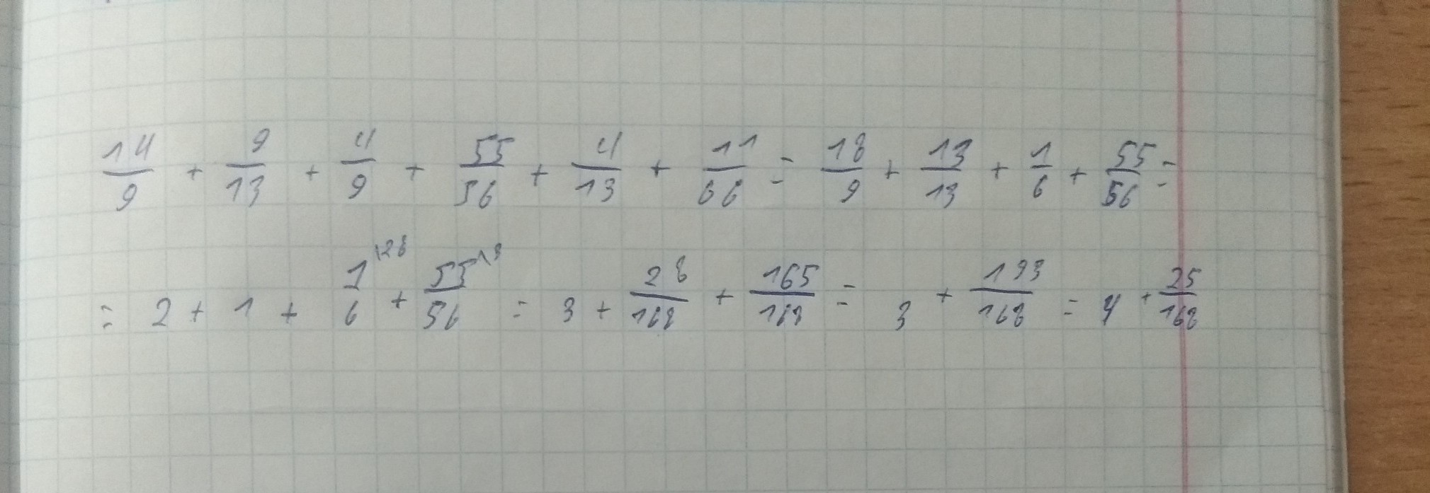 14 девятых + 9 тринадцатых + 4 девятых + 55 пятьдесят шестых +4 тринадцатых + 11 шестьдесят шестых
