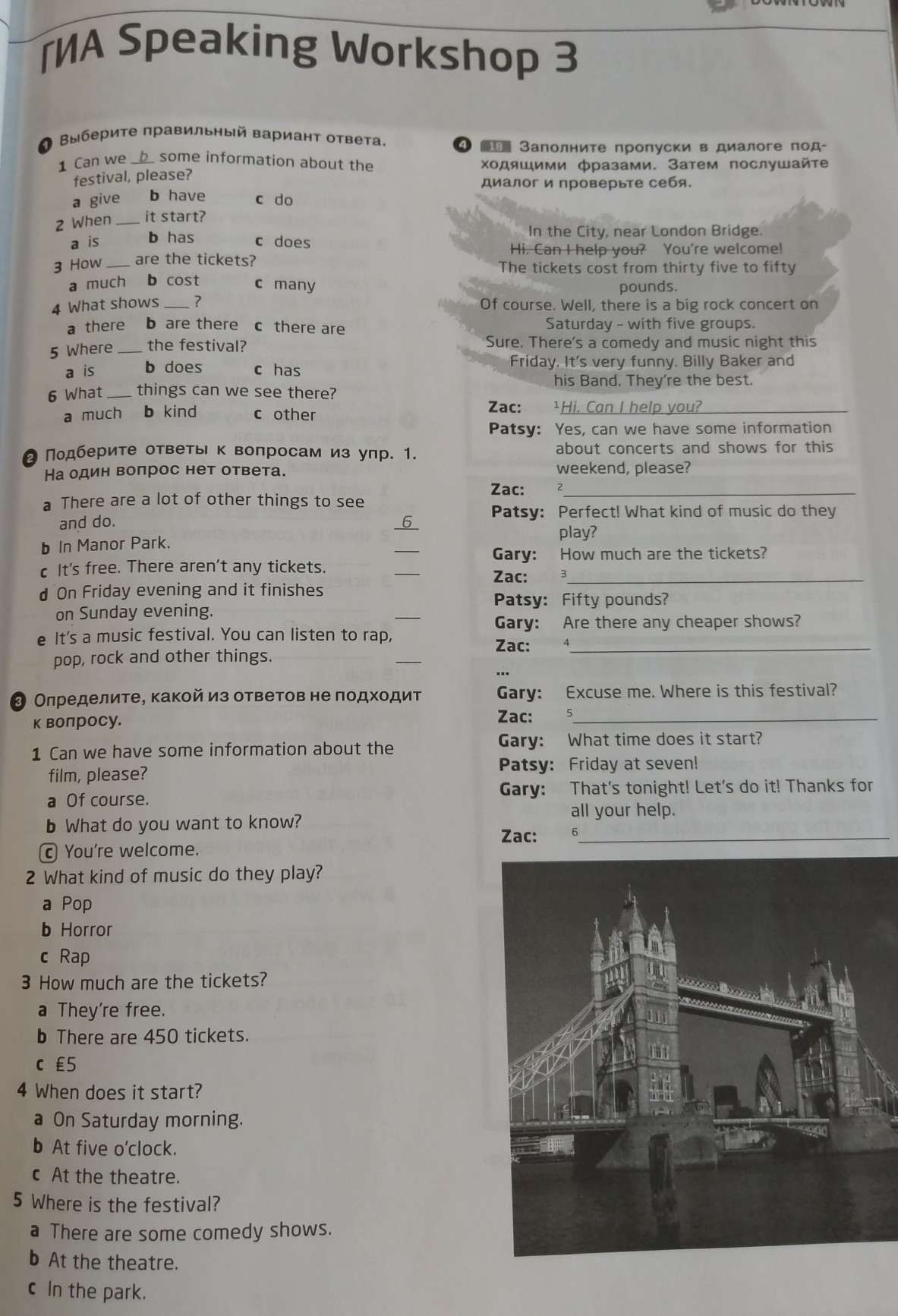 2.b 3.b 4.c 5.a. 2. Of course. Well, there is a big rock concert on Saturday with five groups. 3.The tickets cost from thirty five to fifty ponds. 4.Sure, there's a comedy ...5.In the City, near London Bridge. 6.You're welcome.