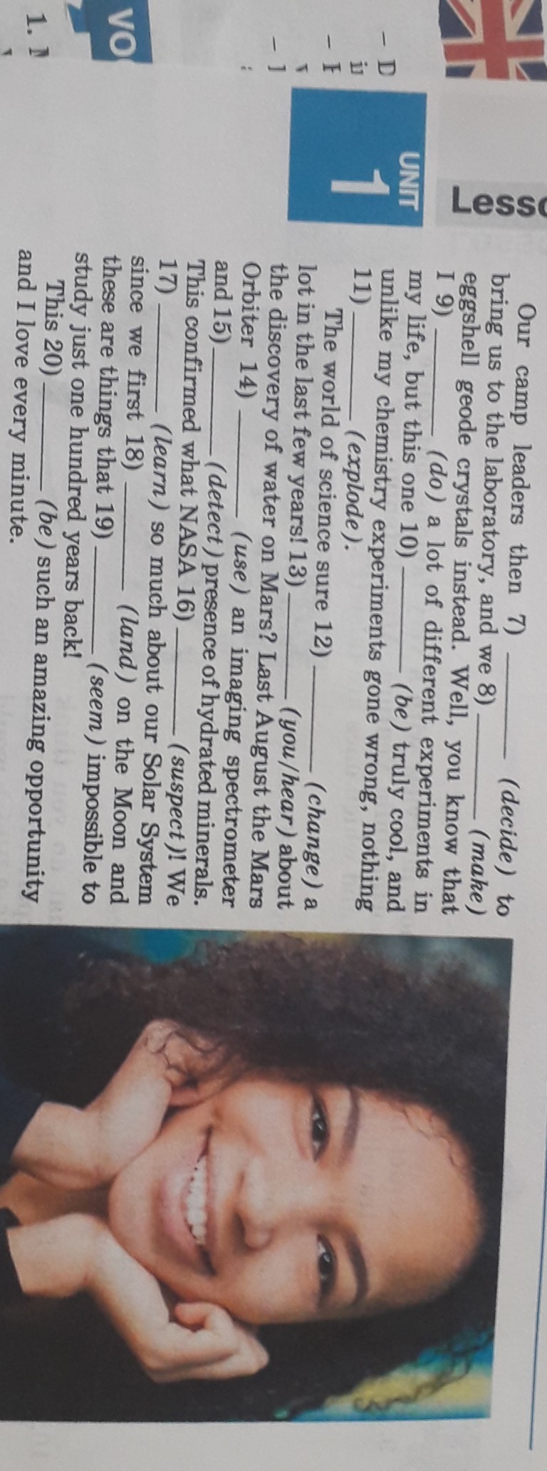 Our camp leaders then 7)(decided) to bring us to the laboratory, and we 8)(made) eggshell geode crystals instead. Well, you know that I 9)(have done) a lot of different experiments in my life, but this one 10)(was) truly cool, and unlike my chemistry experiments gone wrong, nothing11)(exploded). The world of science sure 12)(has changed) a lot in the last few years! 13) (Have you heard) about the discovery of water on Mars? Last August the Mars Orbiter 14)(used) an imaging spectrometer and 15)(detected) presence of hydrated minerals. This confirmed what NASA 16)(had suspected)! We 17)(have learnt) so much about our Solar System since we first 18)(landed) on the Moon and these are things that 19)(seemed) impossible to study just one hundred years back! This 20)(is) such an amazing opportunity and I love every minute.