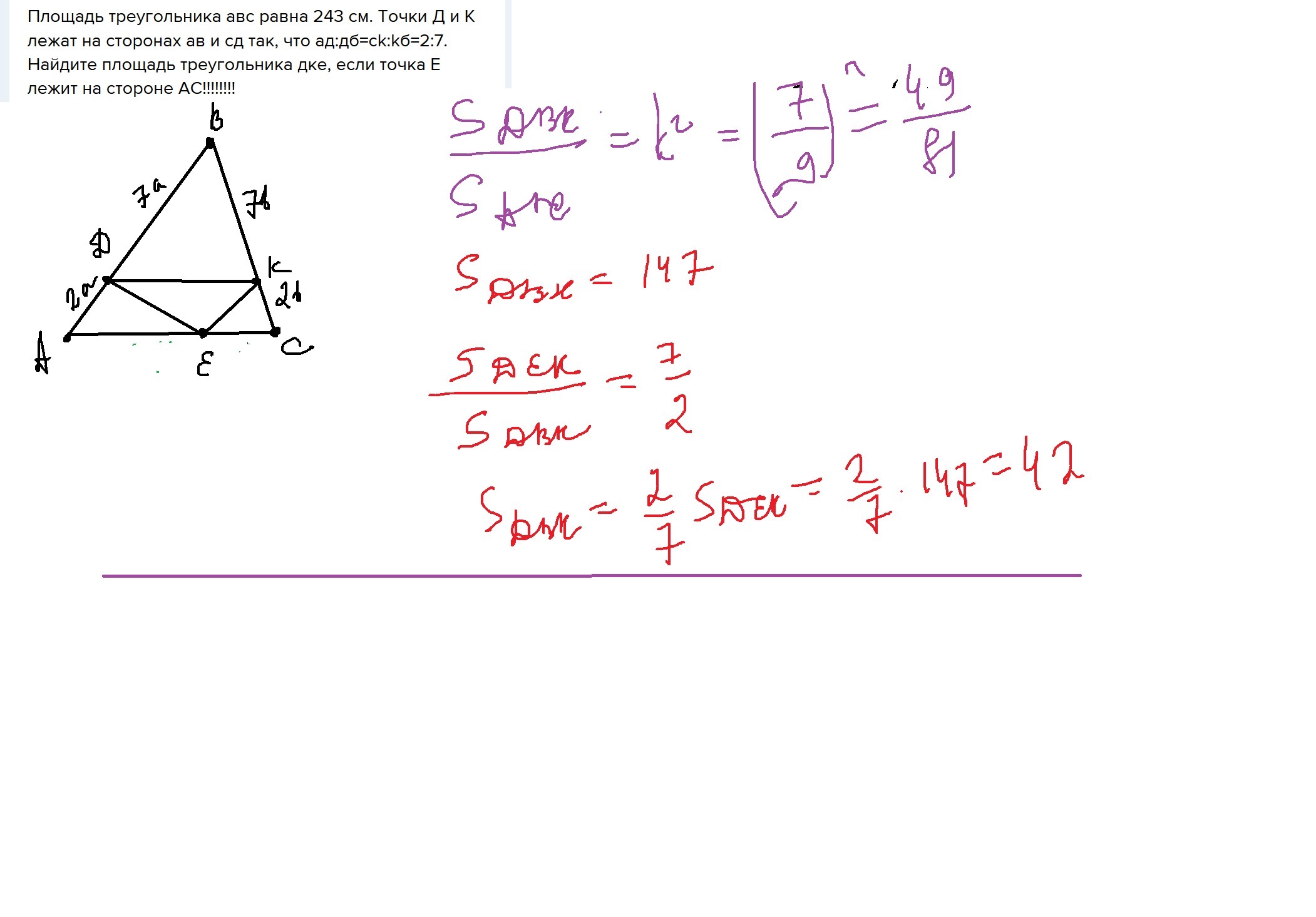Площадь треугольника авс равна 243 см. Точки Д и К лежат на сторонах ав и сд так, что ад:дб=ck:kб=2:7. Найдите площадь треугольника дке, если точка Е лежит на стороне АС!!!!!!!!
