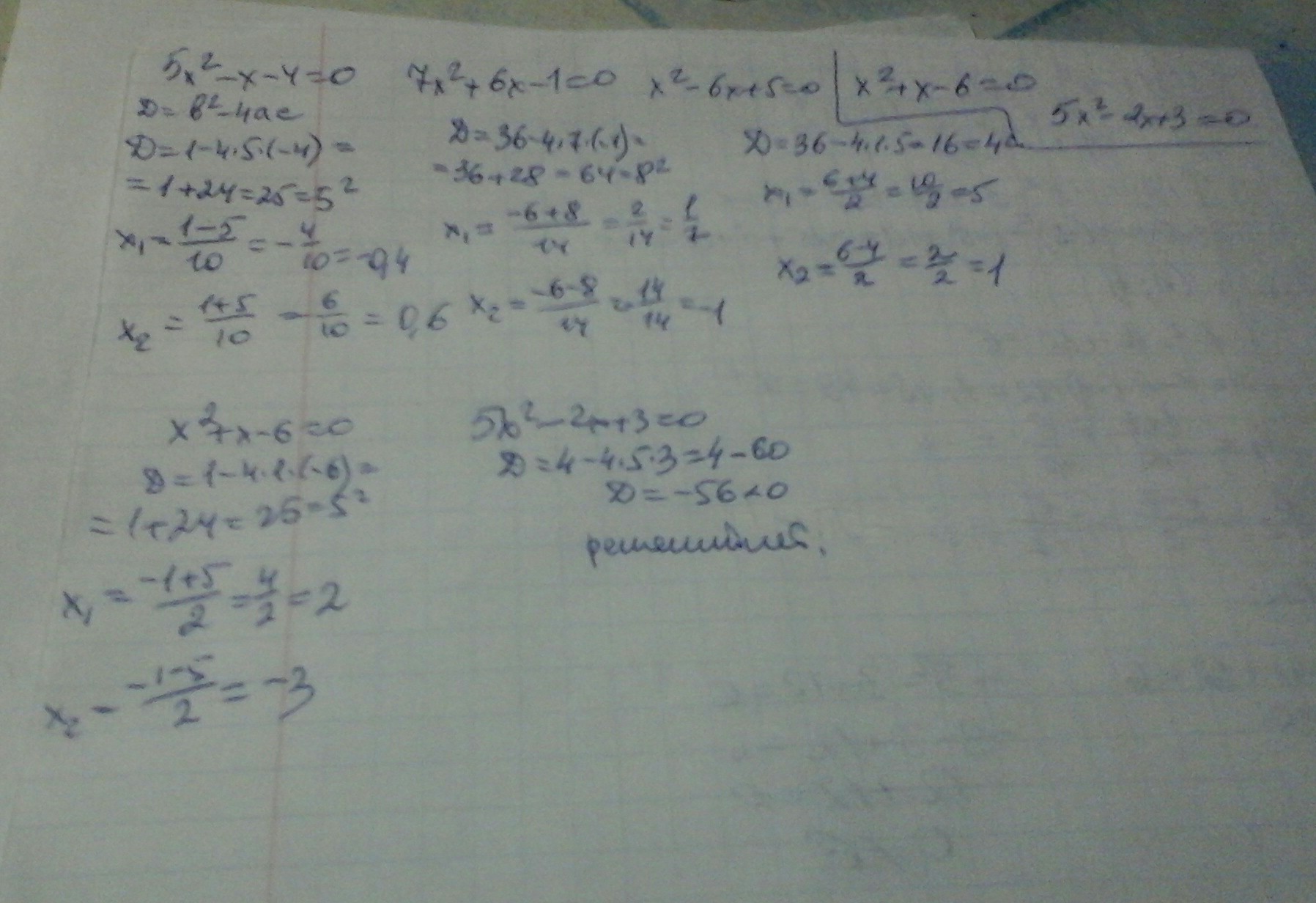 5 х в квадрате - х - 4 равно 0. 7х В квадрате + 6х - 1 равно 0. Х в квадрате - 6 х+ 5 равно 0. Х Квадрате + х - 6 равно 0. 5х в квадрате - 2 х+ 3 равно 0.