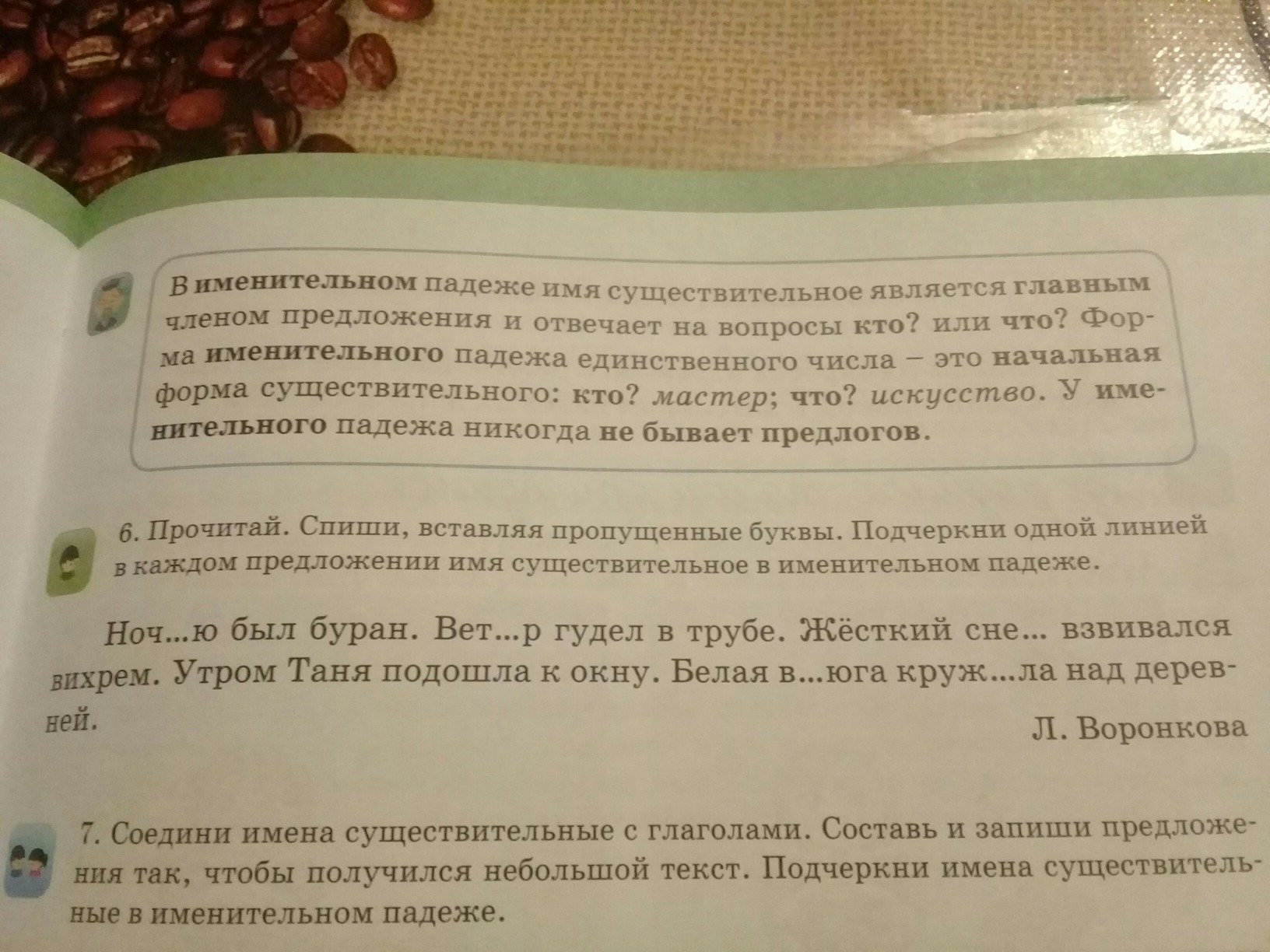 В первом предложении подчеркнуть БУРАН. Во втором ВЕТЕР. В третьем СНЕГ. В четвёртом ТАНЯ. В пятом ВЬЮГА.
