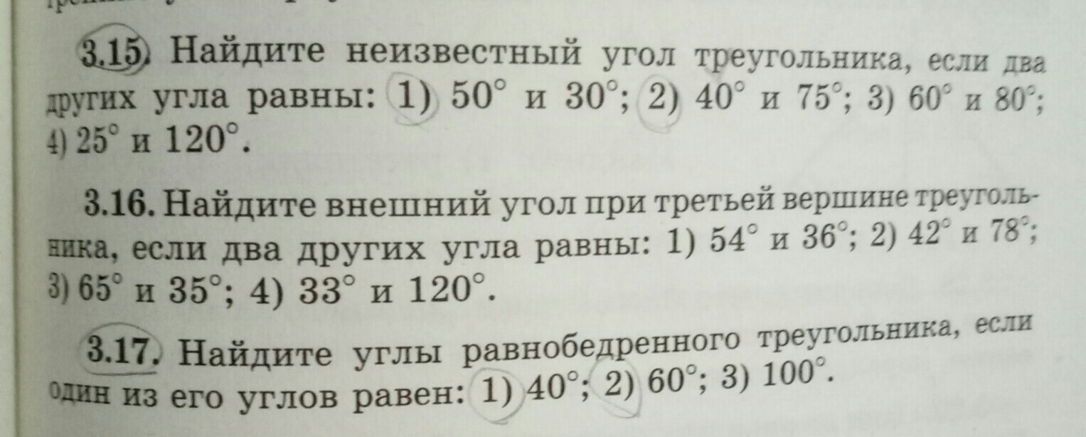 Сумма всех углов треугольника равна 180°, так что находим третий по остаточному принципу