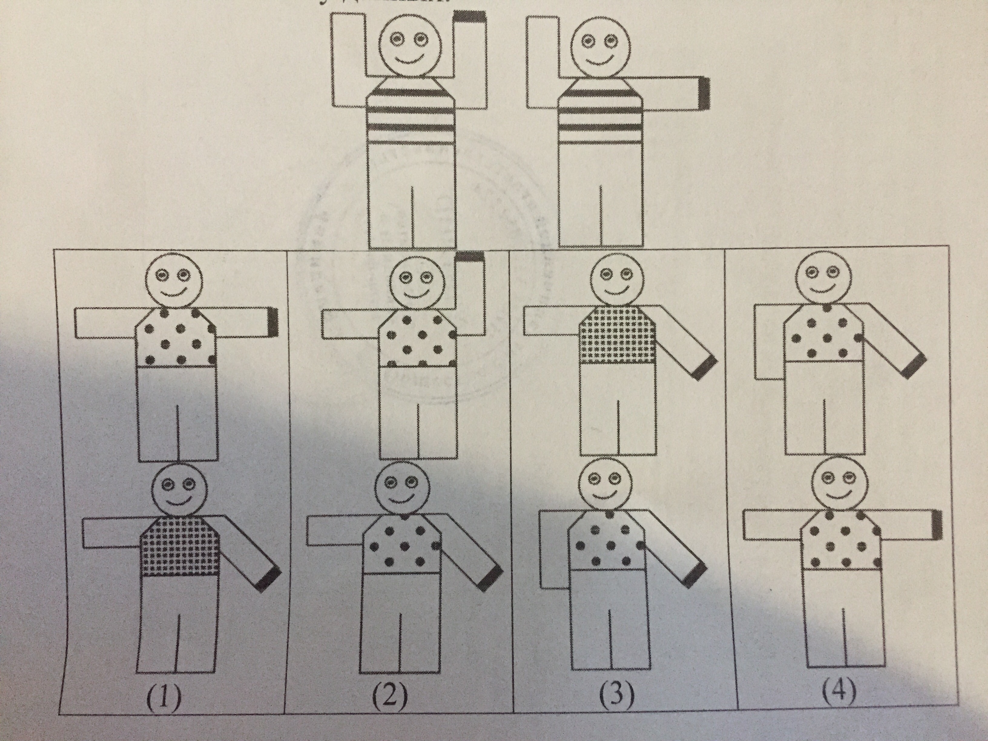 У пары данных человечков есть одинаковые признаки. Выбери пару человечков у которых такое же количество одинаковых признаков, как у данных