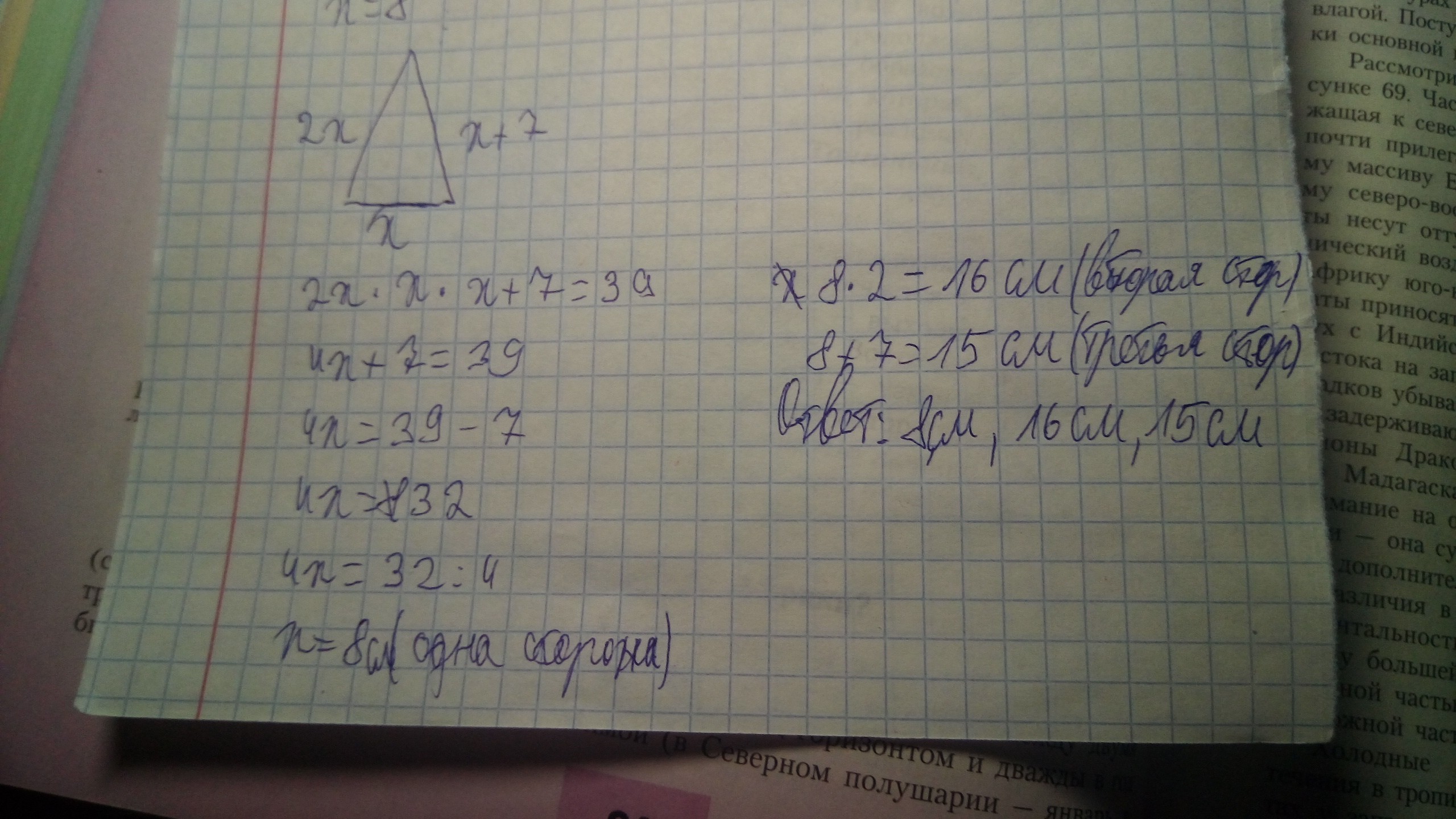Тогда вторая сторона равна 2*8 = 16 см, а третья 8 + 7 = 15 см.
