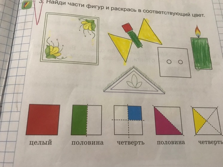 Смотри, внизу у тебя даны фигуры и цвета к ним. Ты смотришь на картинки и, если видишь целый красный квадрат, то раскрась его красным, есть видишь половину квадрата, то нужно его раскрасить в зелёный