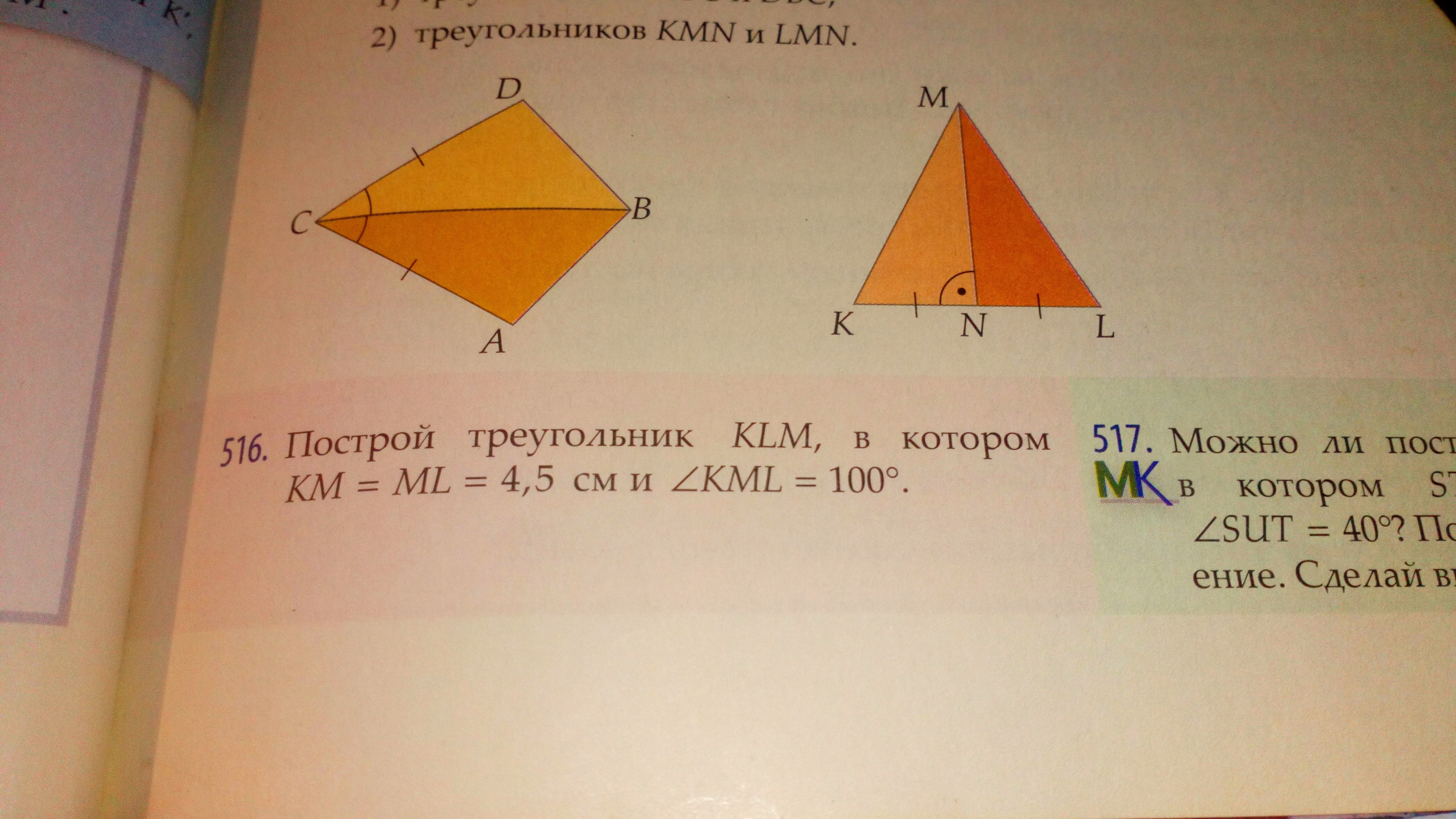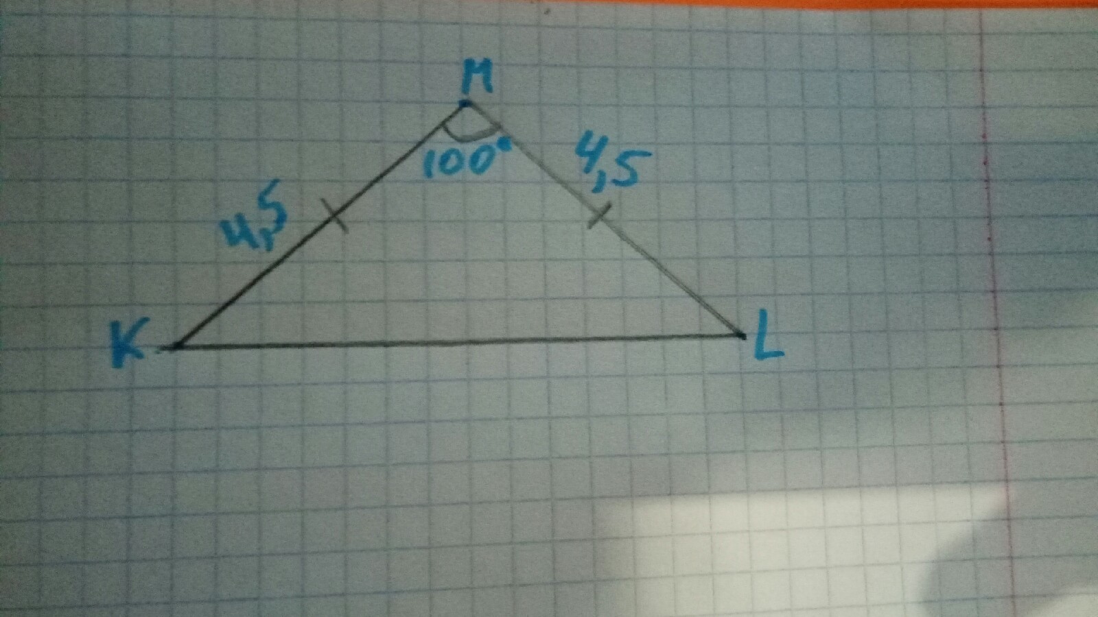 Построй треугольник KLM, в котором KM = ML = 4,5 см и УГОЛ KML= 100°