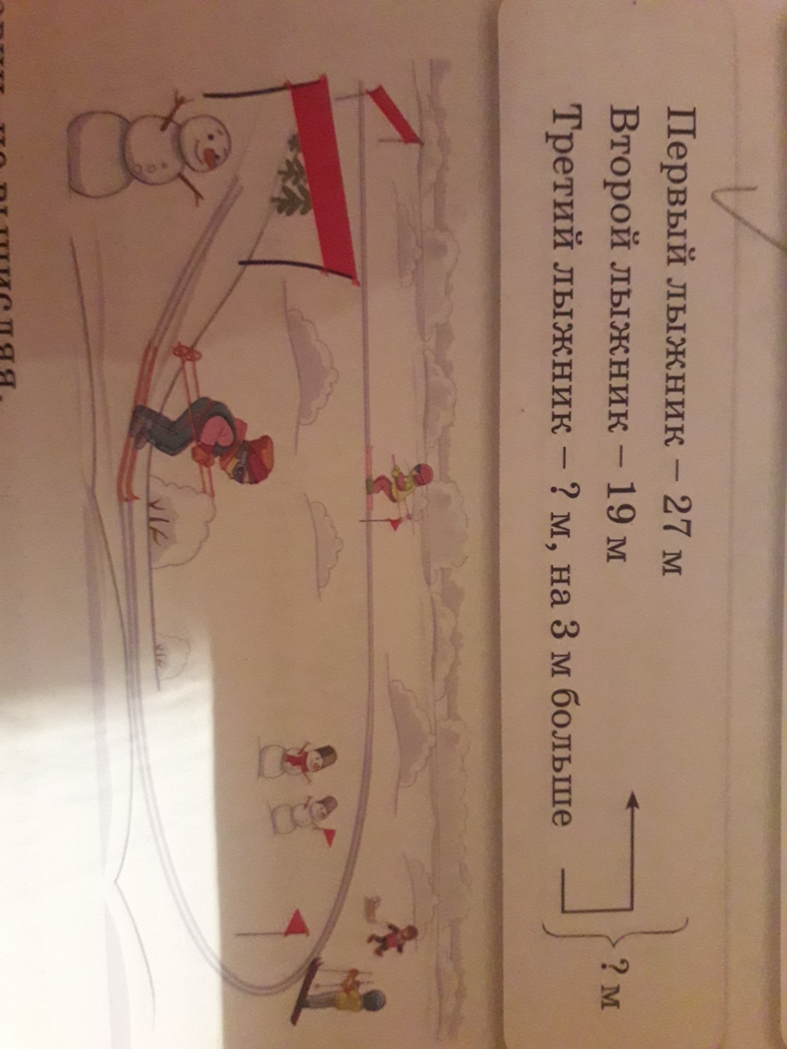 1)19+3=22(м) третий лыжник.
