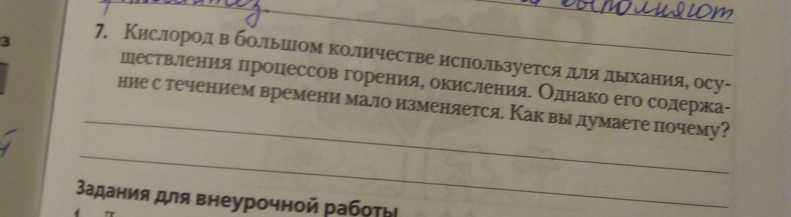 1 вариант: Содержание кислорода со временем мало изменяется, т.к. его вырабатывают растения. (поглощая углекислый газ растения отдают в атмосферу кислород)