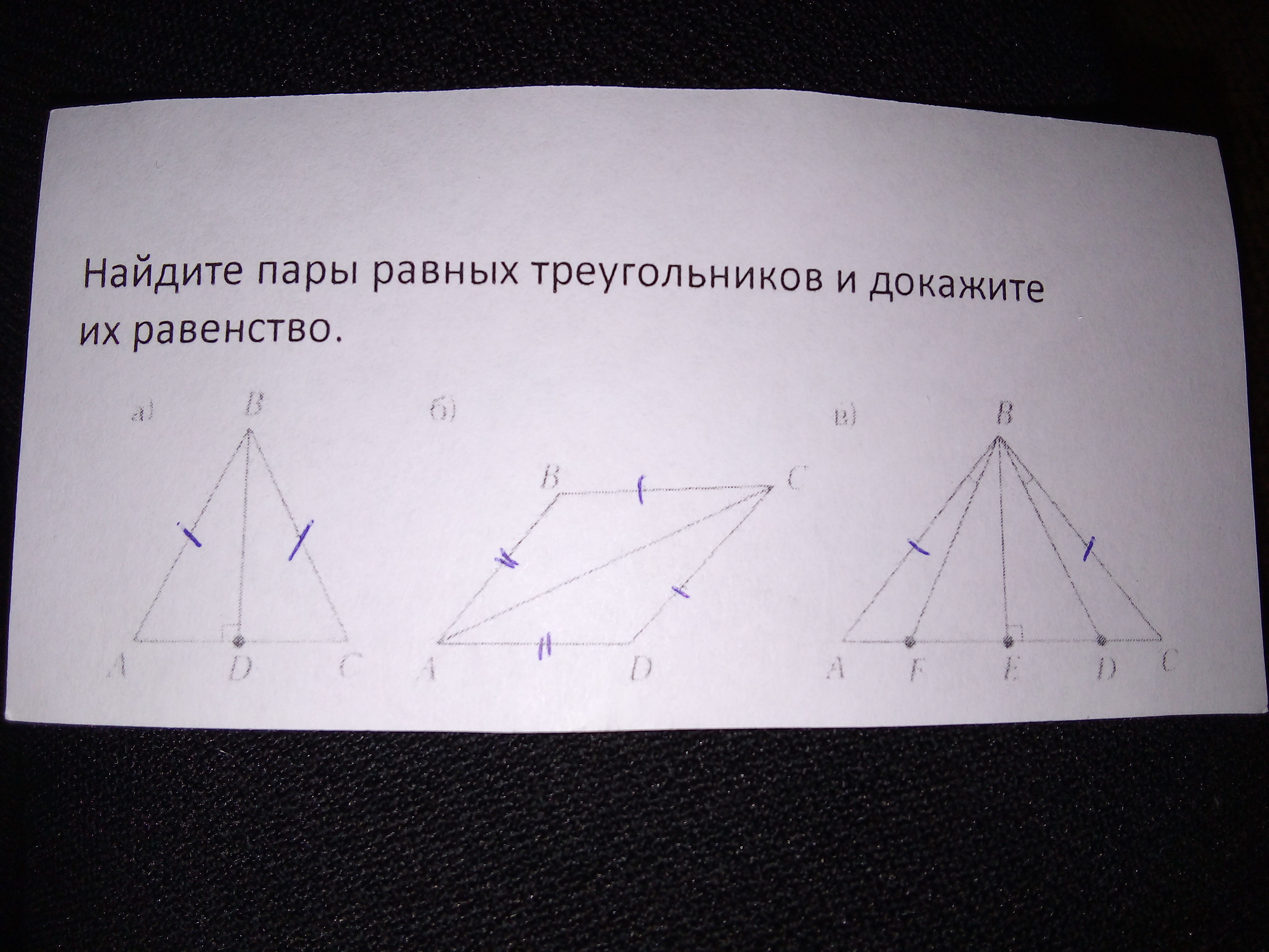 Из этого следует, что BD высота в равнобедренном треугольнике АВС, значит ВD - биссектриса, т е угол АВD равен углу CBD и треугольник ABD = треугольнику CBD по 1 признаку