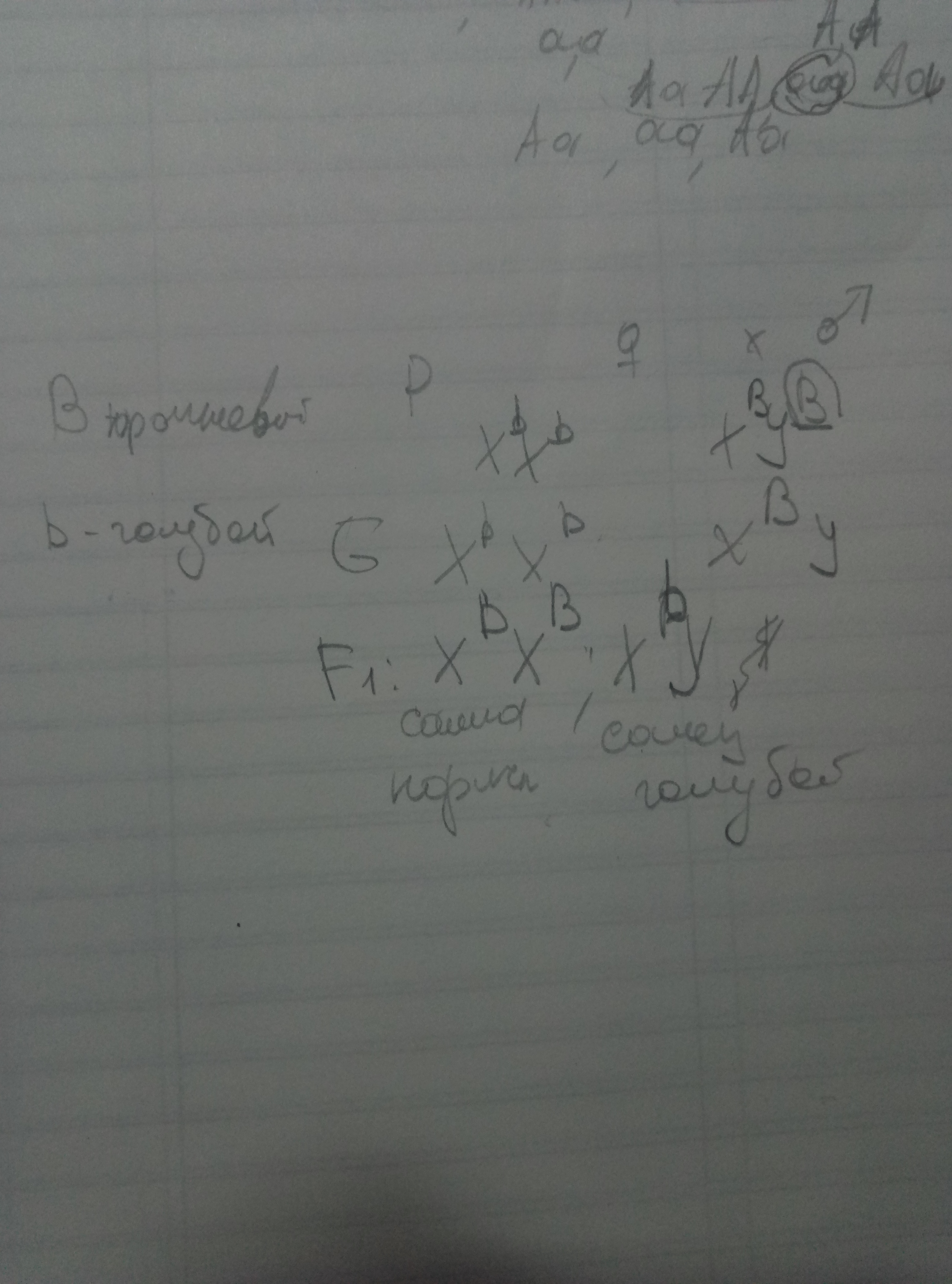 У некоторых рыб самки гомогаметны, а самцы – гетерогаметны, при этом Y-хромосома содержит аллели генов. Обычно эти рыбы имеют коричневую окраску (ген В), а голубая зависит от гена b. Y-хромосома всегда содержит аллель В и никогда – аллель b, следовательно самцы никогда не бывают голубого цвета. Скрестили голубую самку с гомозиготным коричневым самцом.