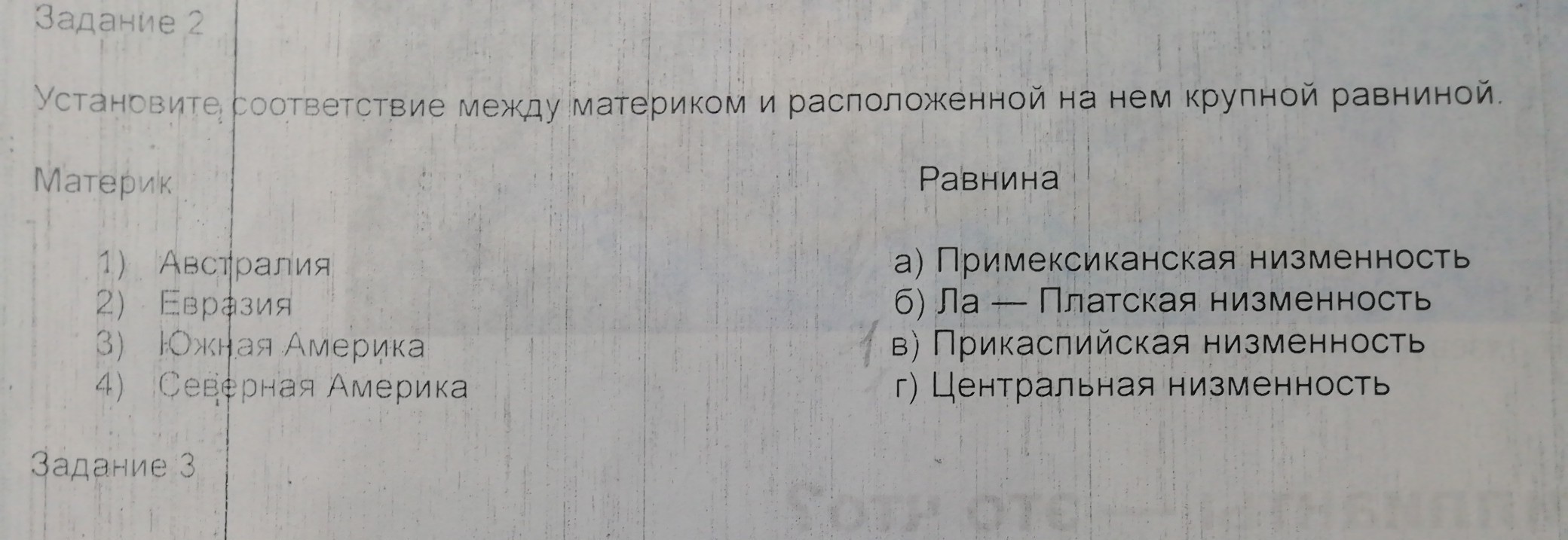 ПОМОГИТЕ ПОЖАЛУЙСТА!!!!! установите соответствие между материком и расположенной на нём крупной равниной