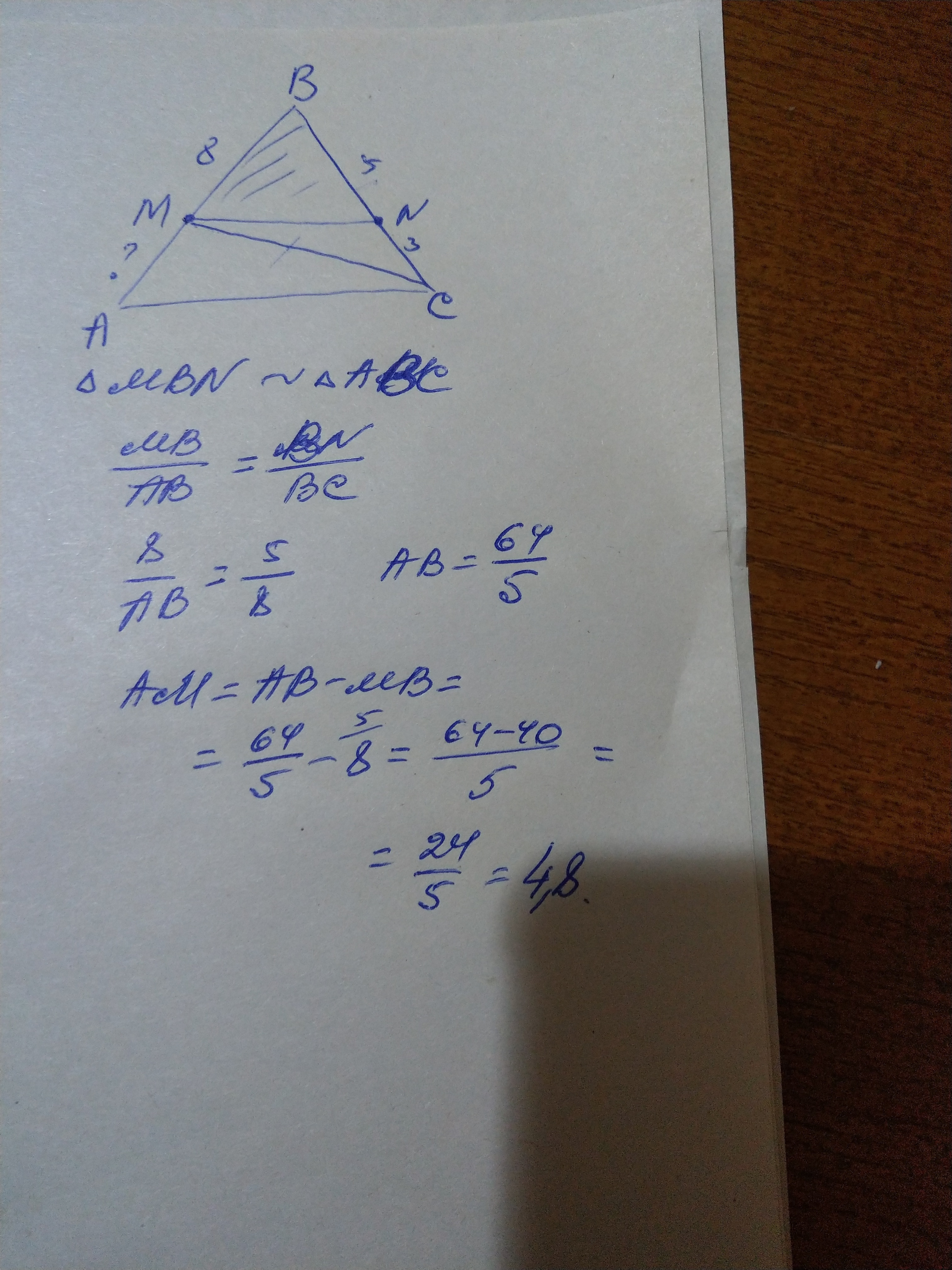 В треугольнике abc на сторонах ab и bc взяты соответственно точки M и N так,что MB =8см, BN=5см, NC=3см. Найдите AM если AC||MN