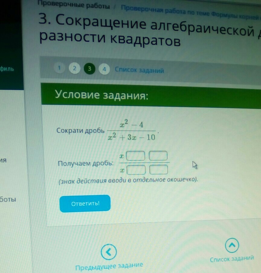 Ответ:Х2 и Х2 взаимно сокращаются. Цыфры 4 и 10 сокращаются до 2 и 5 получается дробь: -2 деленое на 3х-5. вроде так но это не точно