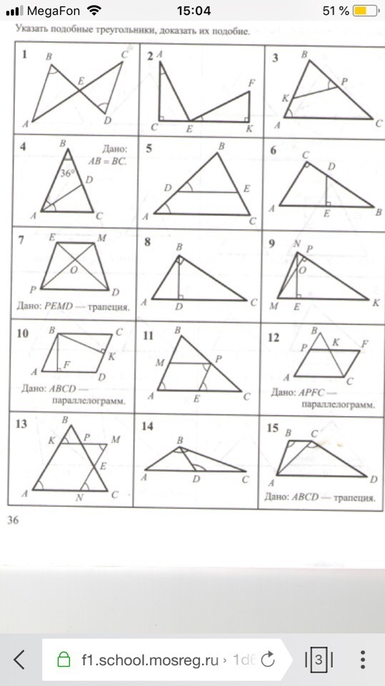 6)треугольники подобны по 3-м углам. B -- общий угол, C=E по условию, А=180-(В+С) D=180-(B+E) A=D