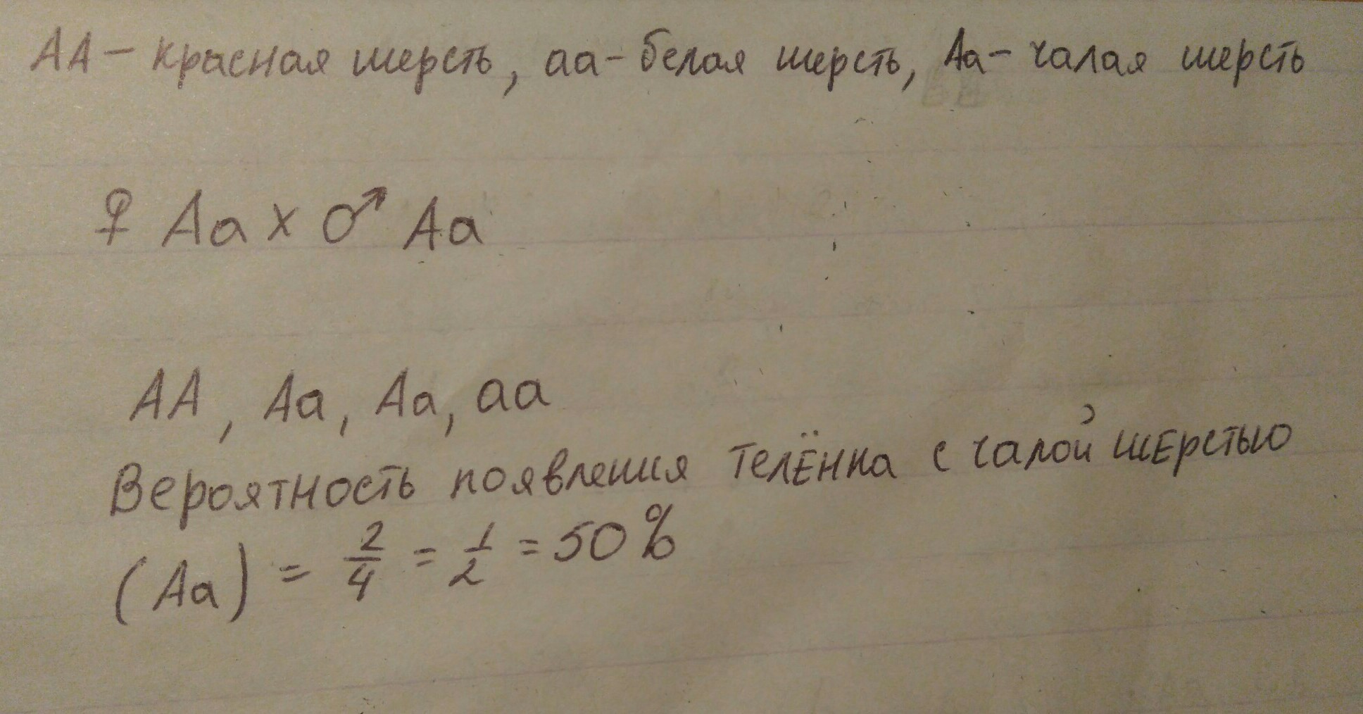У крупного рогатого скота шортгорнской породы, доминантный ген А определяет наличие красной окраски шерсти, рецессивный ген а -белую окраску. Гетерозиготные животные имеют чалую шерсть. Какова вероятность появления теленка чалой окраски от скрещивания двух Чалых животных?