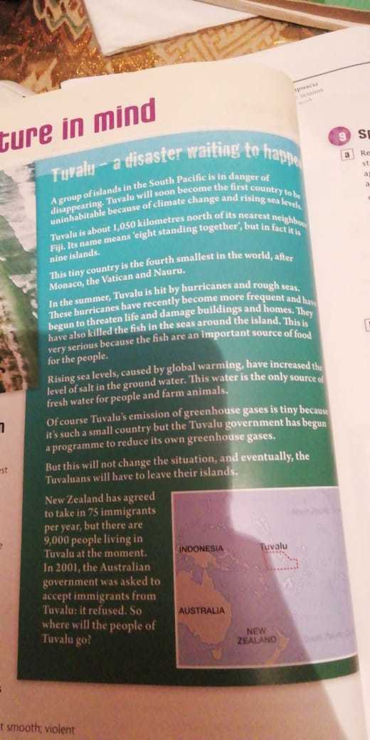 Группа c Исландии в южной части Тихого Океана в опастности исчезновения.Тувалу скоро будет первой странной не пригодной для жизни потому,что изменяеться климат и поднимаеться уровень воды в море.Тувалу близко 1050 км на север его ближайший сосед Фиджи.Это имя означает'что мир стоит вместе',но по факту это девять островов.