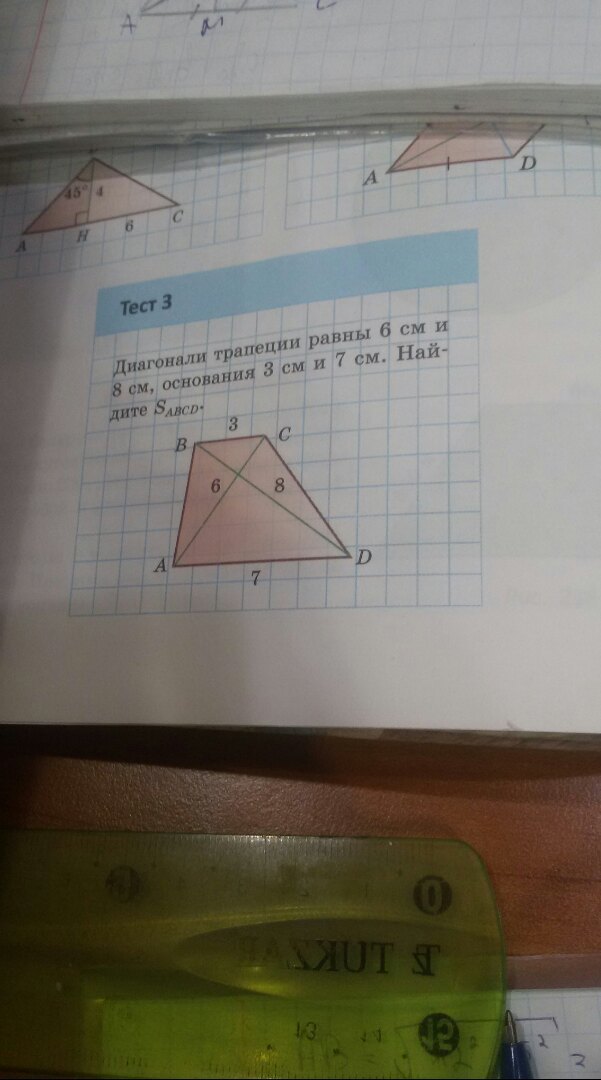 где d₁ - AC=6 см, d₂- BD=8 см, a - AD=7 см, b - BC=3 см;