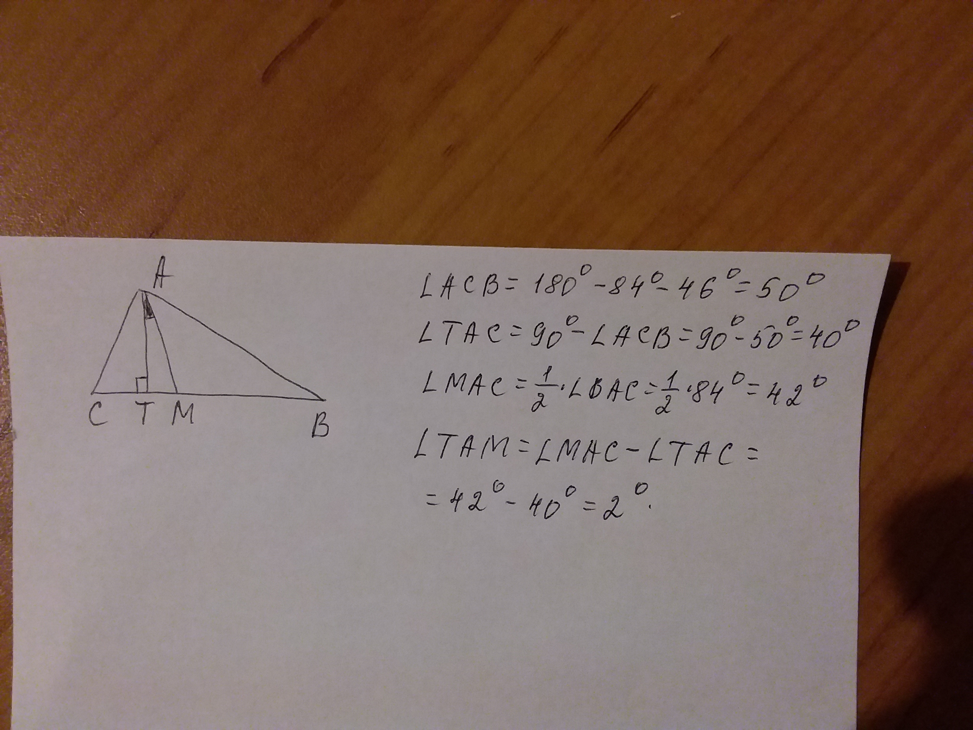 У трикутника АВС проведено висоту АТ і бісектрису АМ Знайти кут ТАМ якщо кут ВАС=84 градусів, кутАВС = 46