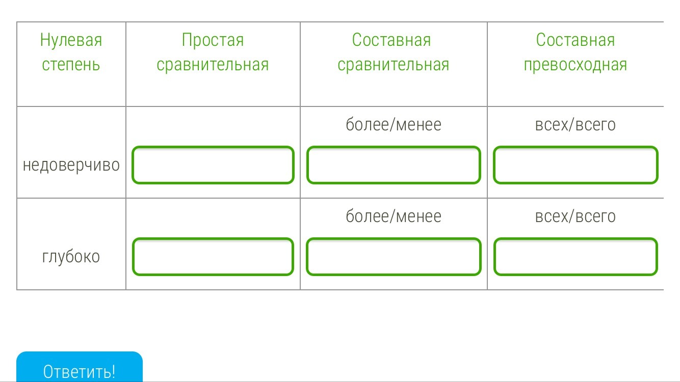 Образуй от наречий все возможные формы степеней сравнения. Если какую-либо форму образовать нельзя, оставляй поле ввода пустым.