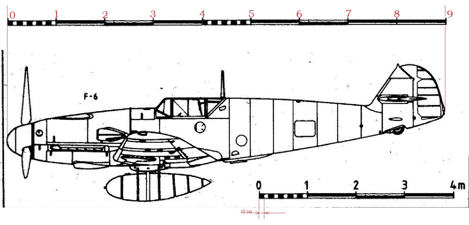 Внизу, это и есть типа линейки, вот напримере самолета снизу, его длина составляет 9 м. Если посмотреть внимательней, то можно заметить, что расстояние от 0 до 1, поделена на равные части, это цена деления этой самой линейки, и она составляет 10 см. Другими словами, можно замерять нужное расстояние с помощью обычной линейки и переводить расстояние в нужное. Ну исключительно точно всяко не будет, потому как это всего лишь картинка.