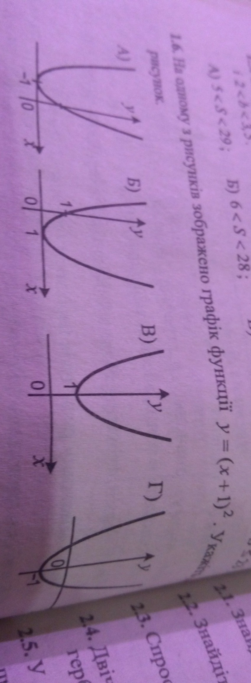 Когда получаете такие задания, всегда подставляйте контрольную точку х = 0 в уравнение кривой. В нашем случае y = (0 + 1)² = 1. А теперь ищите рисунок, где график проходит через точку (0;1). В нашем случае это вариант В)