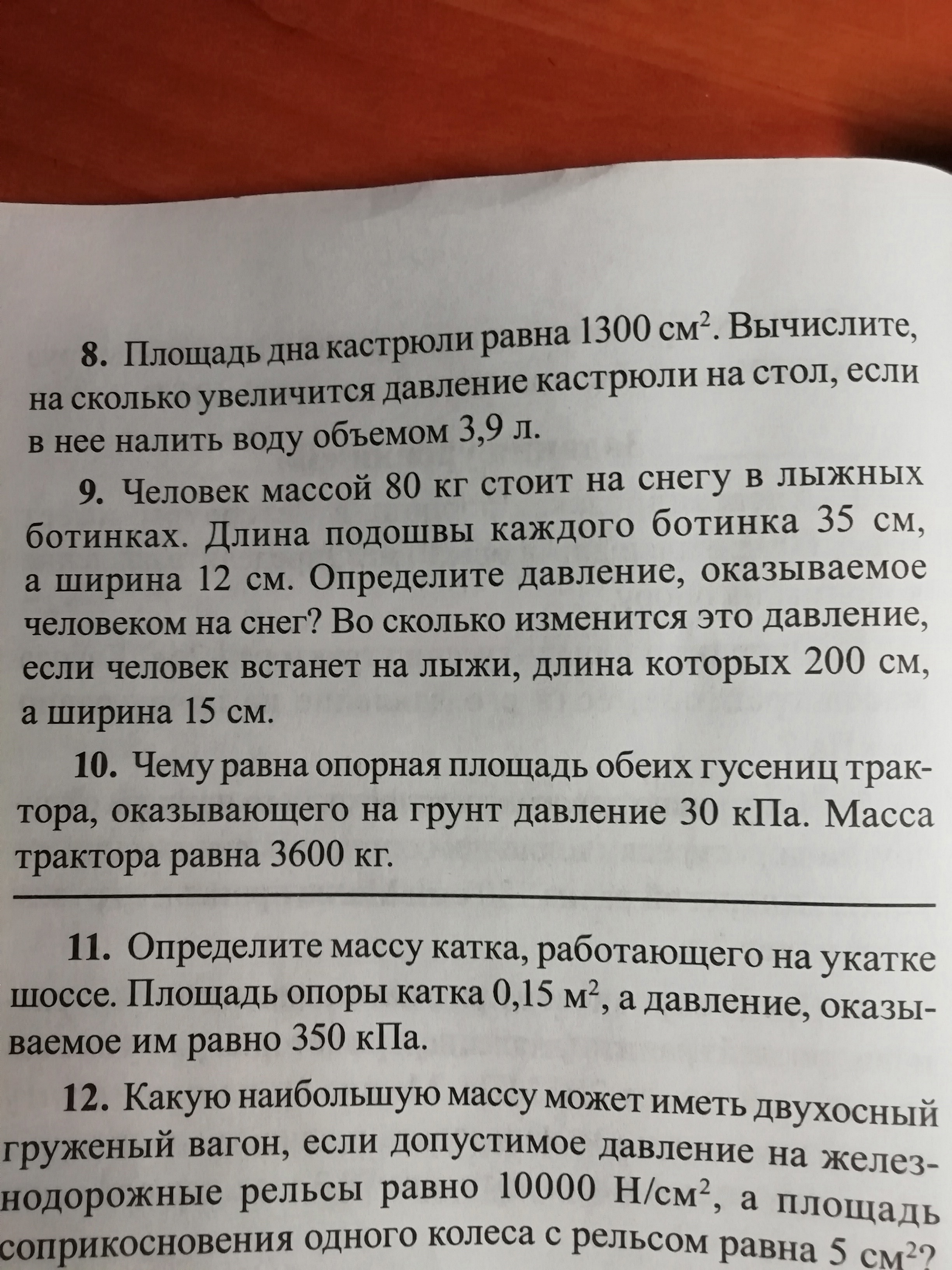 9 Узнаешь площадь лыж,ПОДОШВ(их 2).Опять F=gm P=F/S и СИ не забывай.А потом большее P делить на меньшее P и ответ готов